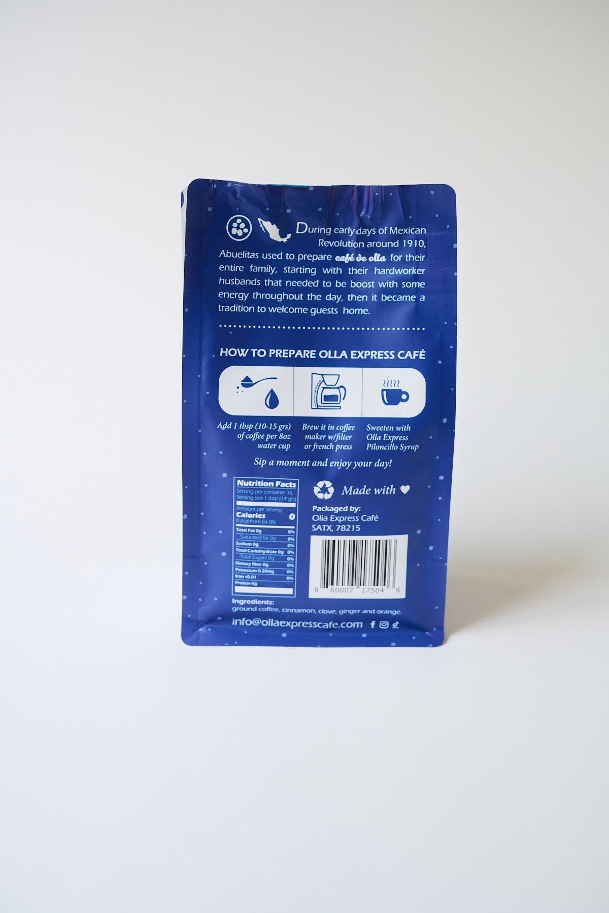 - Ground coffee mixed with spices (cinnamon, clove, ginger and citrics) infused in Mezcal
