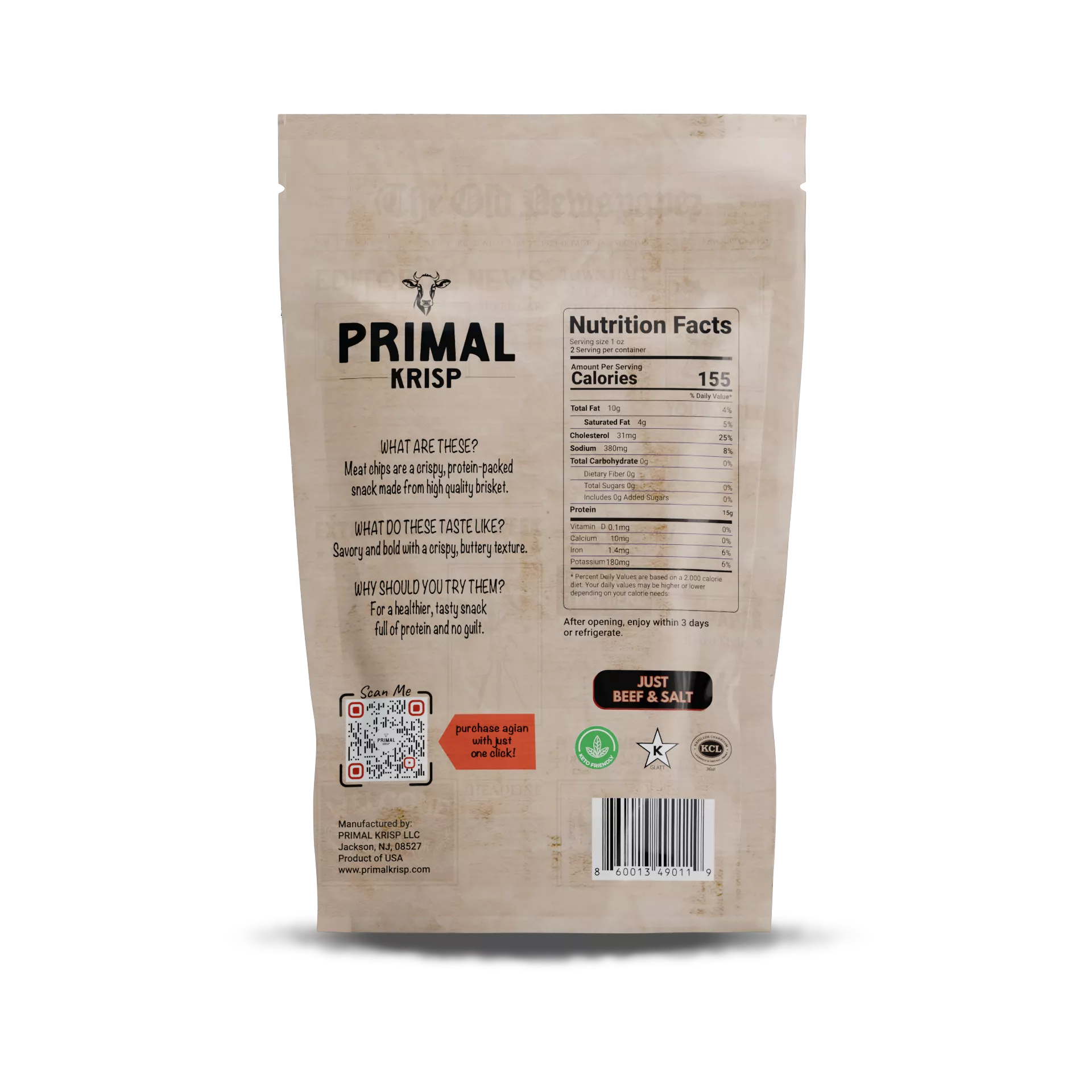 Made from marbled second-cut brisket and seasoned with salt, BRISKET: 2ND CUT beef chips deliver bold flavor and a satisfying crunch. With premium American-raised beef and no additives or sugar, they offer pure protein in every bite. Kosher-certified and perfect for anytime snacking.
