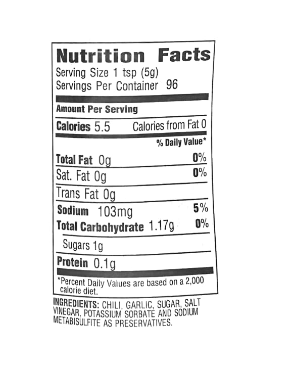 Ingredients: chili 61%, sugar syrup, salt, garlic, water, acids: E260, E330, flavor enhancer: E621, stabilizer: E415, preservative: E202