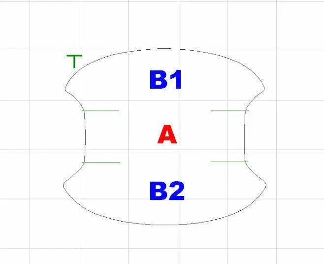 Please follow these guidelines for the best results. Clean the painted surface behind the door handles. It is good to have a hair dryer or heat gun around during install. Light heat can help you shape the product. The top of the cut out is labeled on the back side. Make sure that the relief cuts are separated by gently pulling the tabs to the side of section A out (see picture 2 above). You will want to align this area horizontally behind the door handle. Once this is pushed flat against the paint (use your fingers), you can start at point B1 or B2. Push down in the center and then push the material to the left. Extra material should overlay in the area of the relief cuts. Then complete the top or bottom by pushing the material out from the center to the right. If you started with B1, do the same to B2 and vice versa.