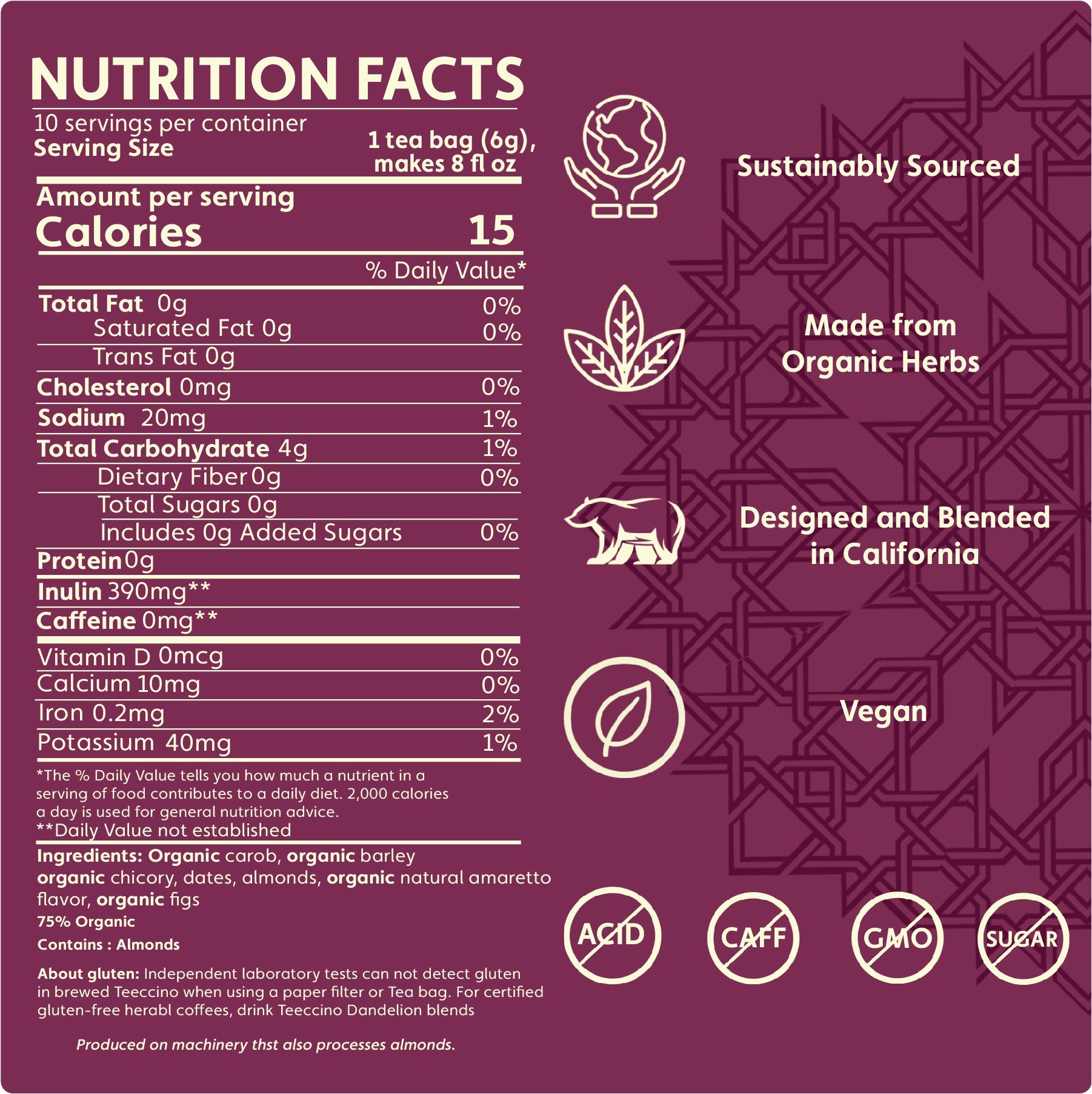 A sensory indulgence of roasted chicory over golden roasted almonds with hints of cherry and apricot. Subtly sweetened with dates and figs.