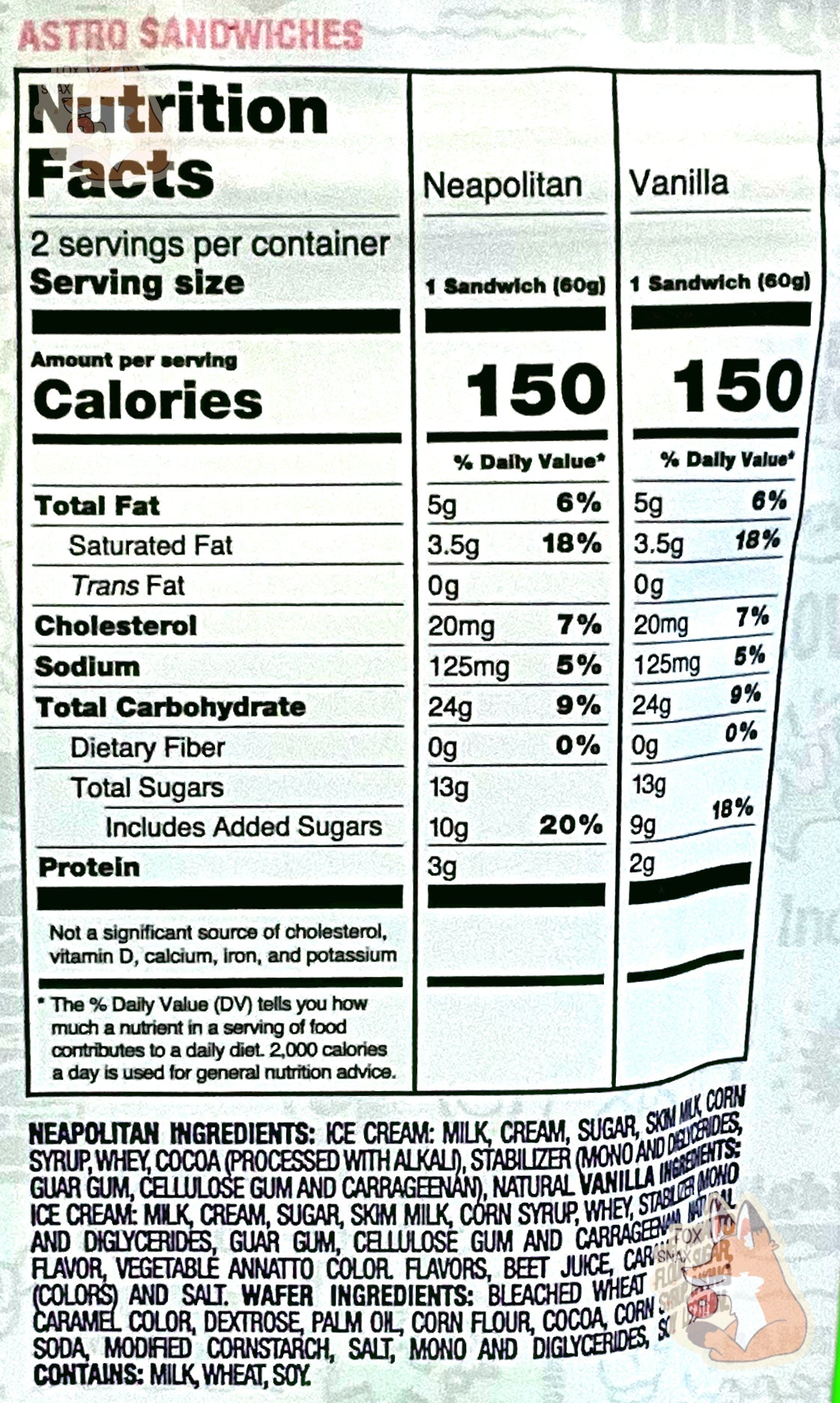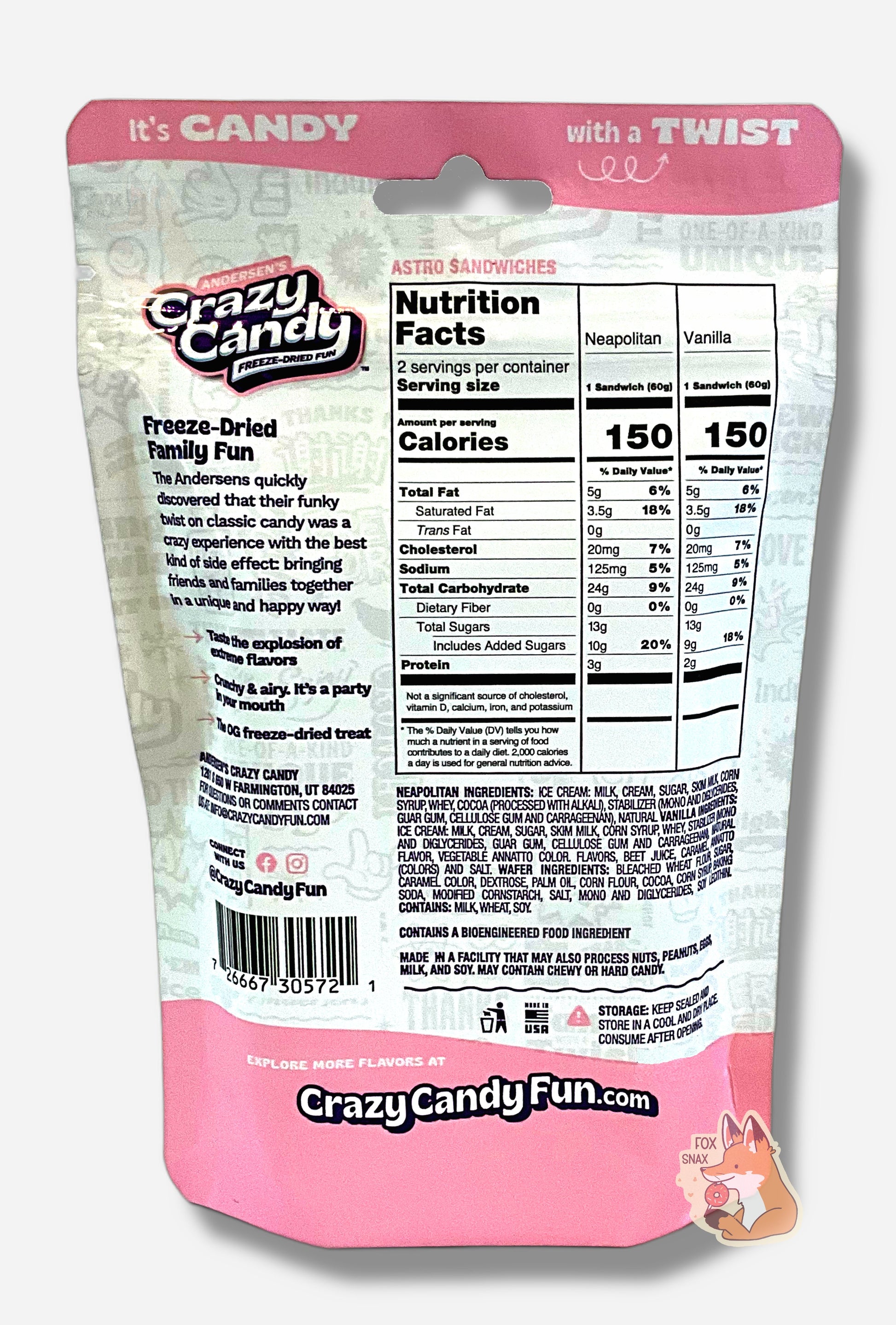 Indulge with Andersen's Astro Sandwiches - delicious freeze-dried ice cream sandwiches! Each bag comes with one each of Vanilla and Neapolitan Astro Sandwiches, perfectly balancing crunchy and creamy goodness that melts in your mouth. Perfect for versatile snacking!
