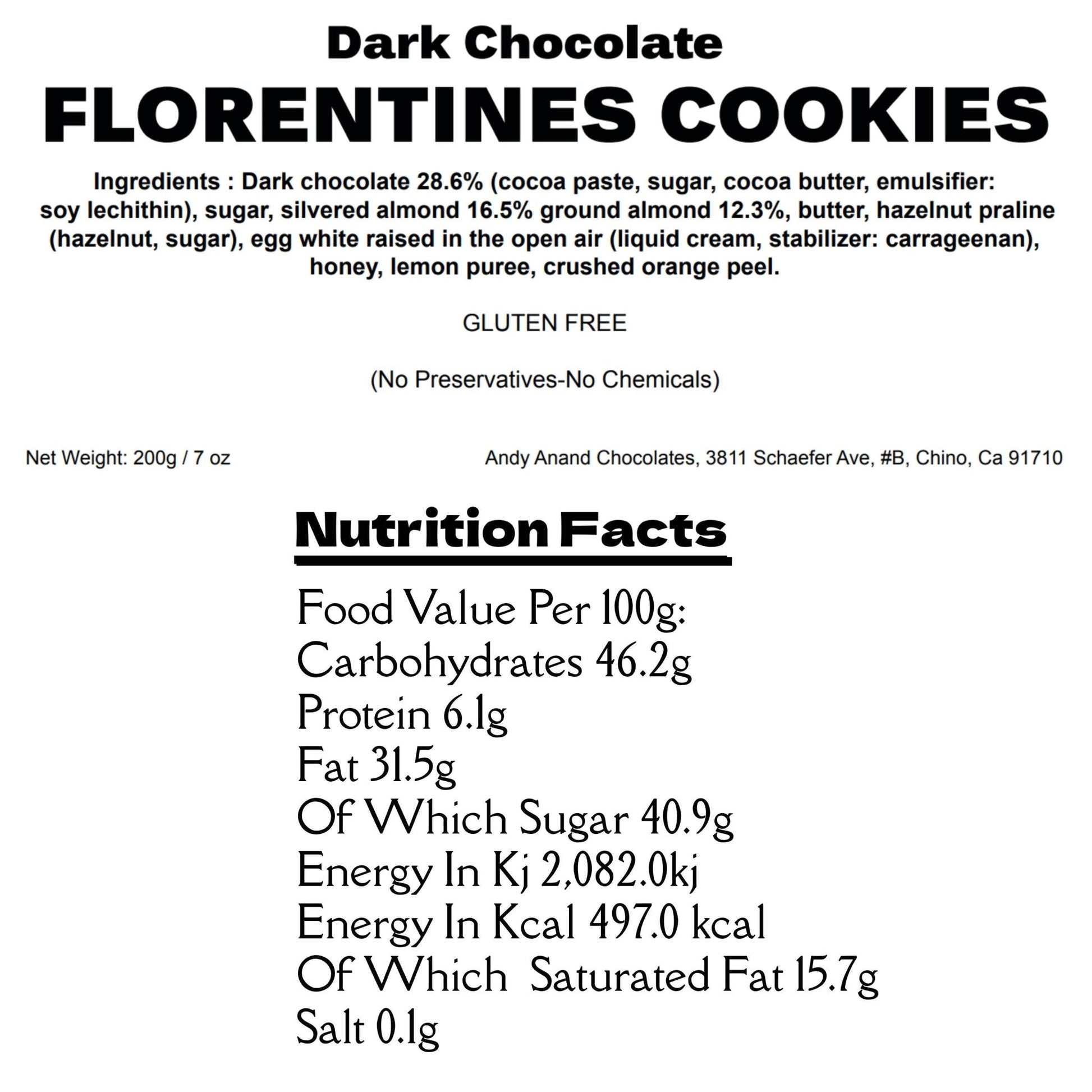 Enjoy the rich crunch of Andy Anand's dark chocolate Florentine biscuit, delicately baked with sliced almonds, orange peel, honey, and confit fruits, then hand-dipped in premium Italian dark chocolate.
