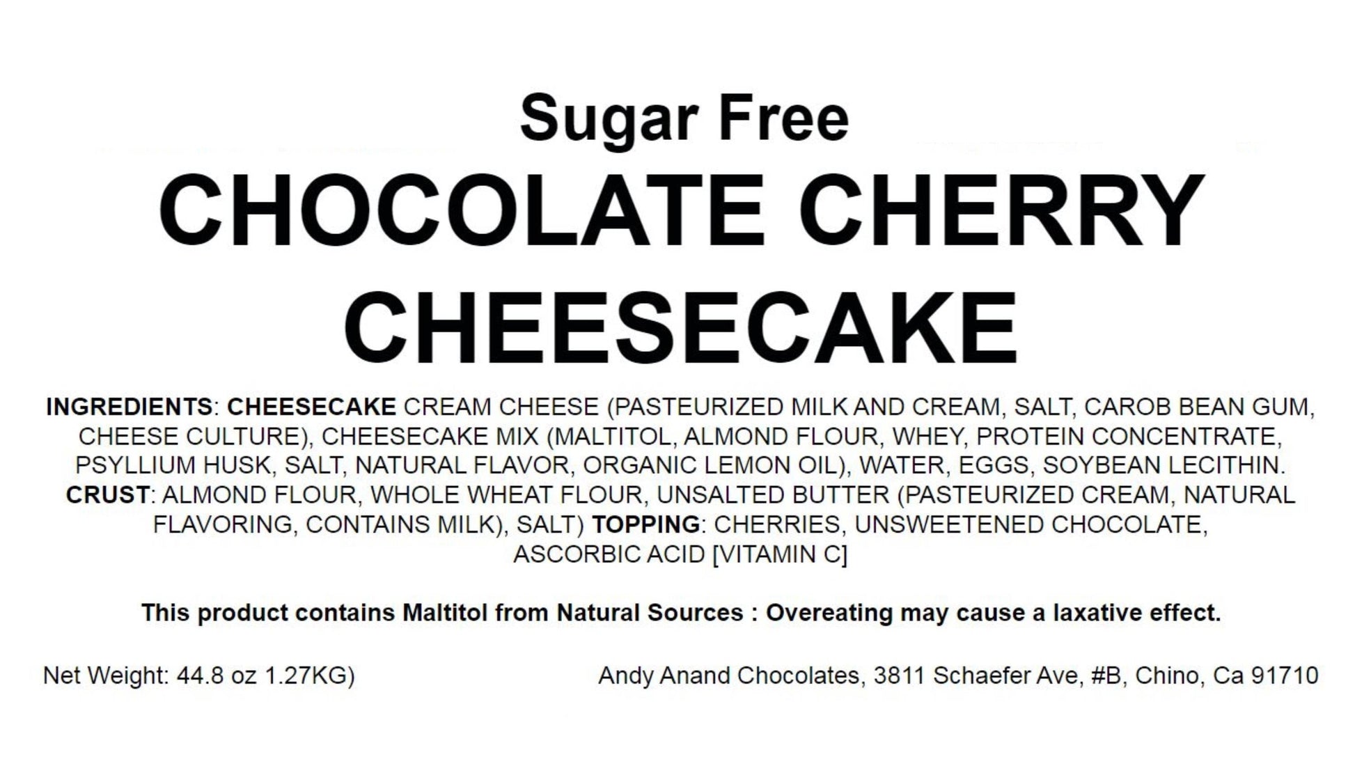 Crafted with California Cream Cheese: Andy Anand’s Sugar Free Chocolate Cherry Cheesecake uses 100% real California cream cheese, fresh eggs, and vanilla for a light, fresh, and satisfying taste.