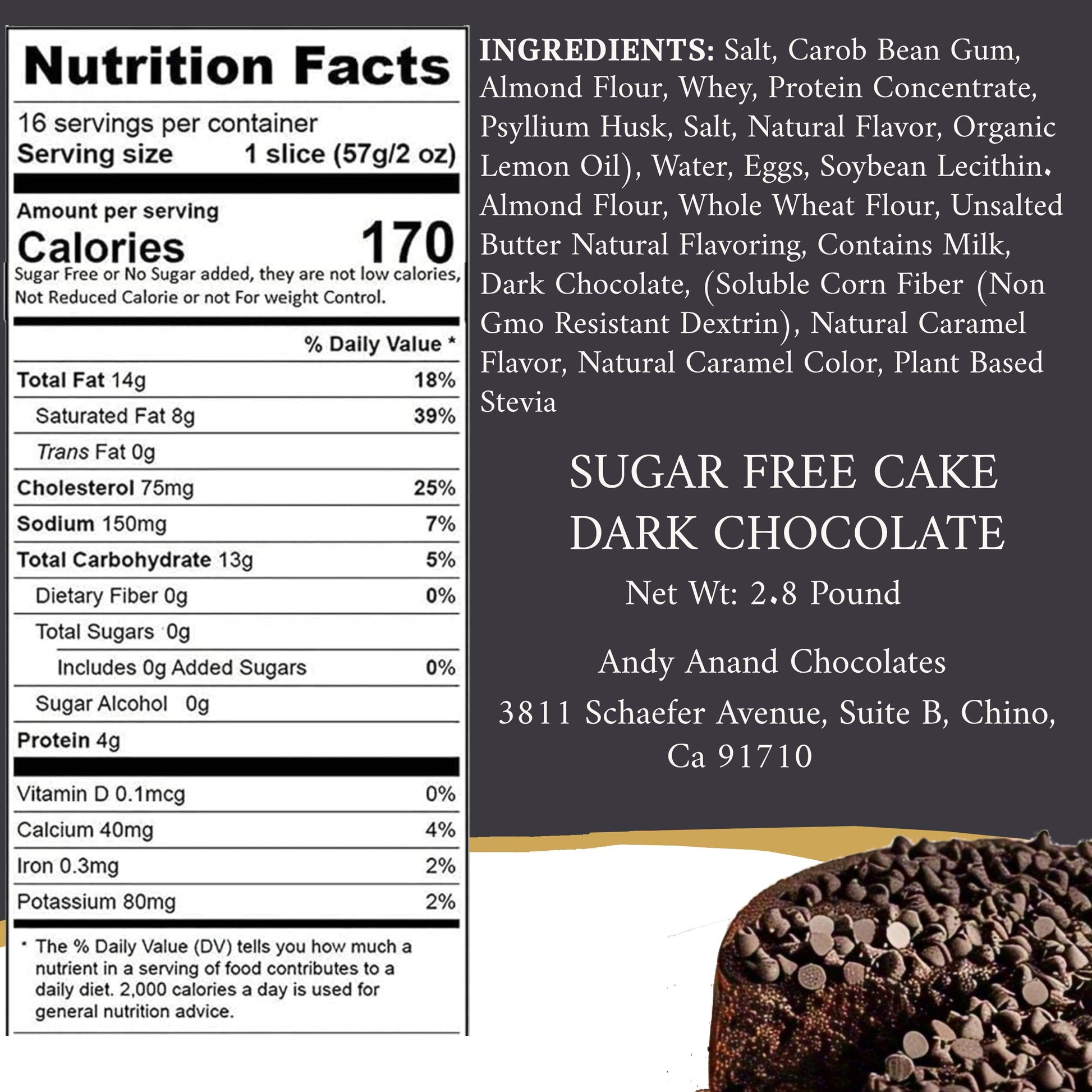 Expertly made in California by skilled artisans, Andy Anand’s Sugar Free Chocolate Chip Cake is carefully handcrafted—not mass-produced—offering rich, authentic texture and gourmet excellence recognized for its award-winning quality, making it a luxurious treat or thoughtful gift.