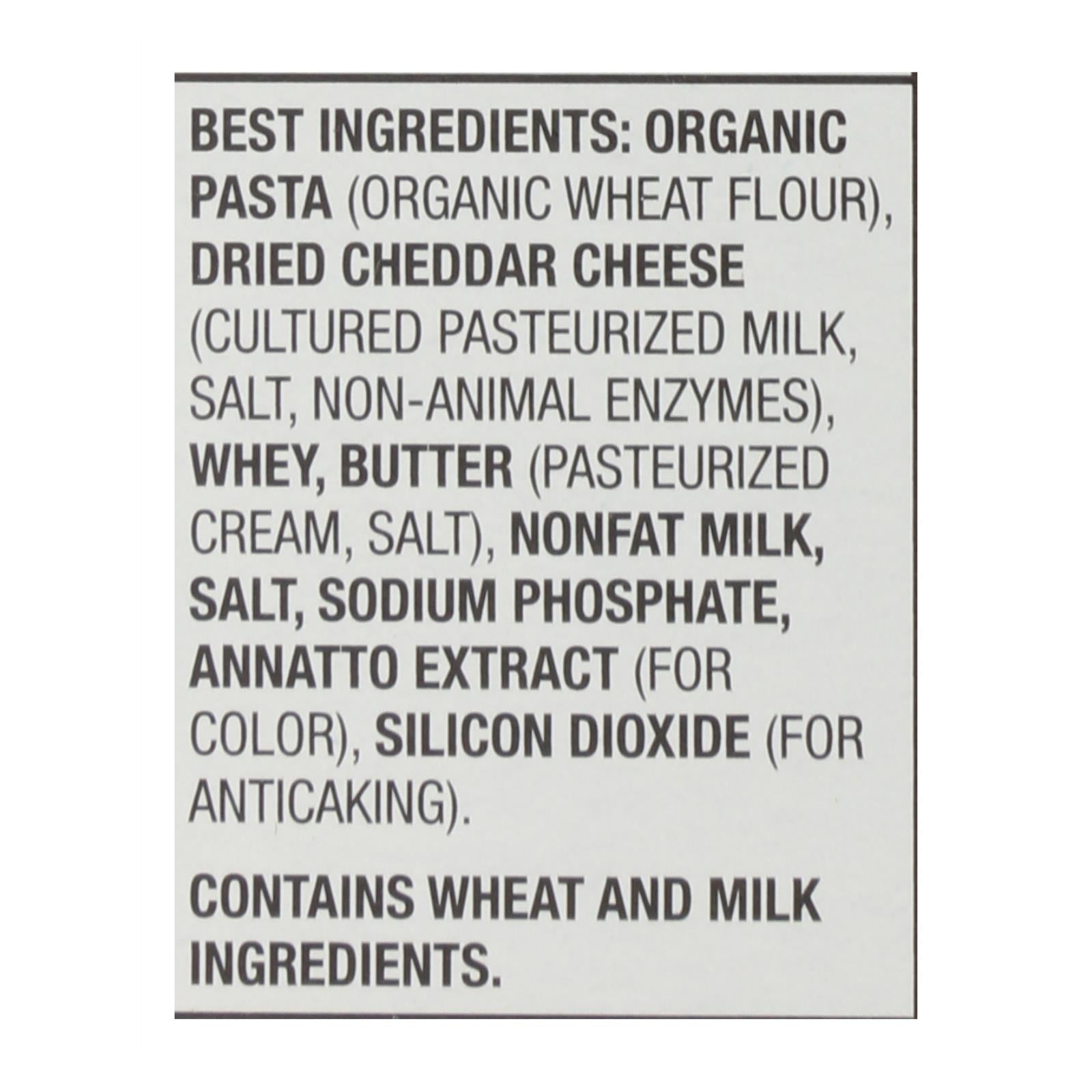 Delight in a meal that combines wholesome goodness with irresistible flavor. This organic macaroni and cheese features shell pasta made from organic wheat and is paired with real aged cheddar cheese sourced from hormone-free cows. It's a nourishing choice with 10 grams of protein per serving and a rich source of calcium, perfect for complementing your favorite entrees.