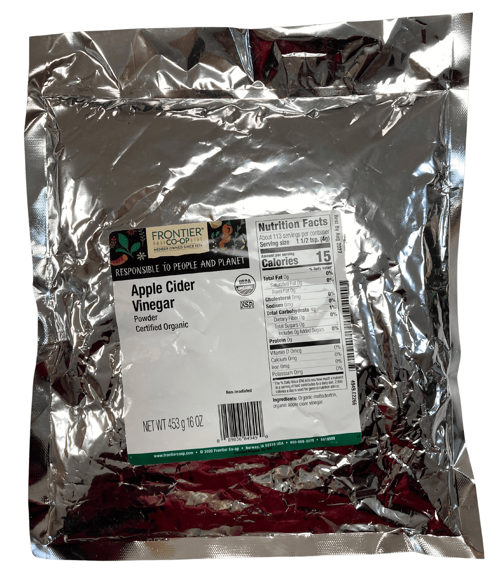 Frontier Co-op Organic Apple Cider Vinegar Powder has a very pungent apple flavor and tangy taste with a sweet note. This dehydrated apple cider vinegar provides the maximum ACV flavor, color and aroma to a variety of food products and beauty applications without the mess, waste and handling problems associated with liquid vinegar.