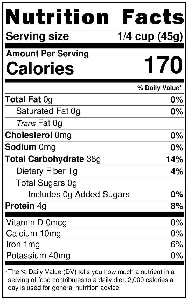 Product packed in a facility that also handles nuts, peanuts, soy, sesame, and wheat. 1 lb, 5 lb, 25 lb sizes only.