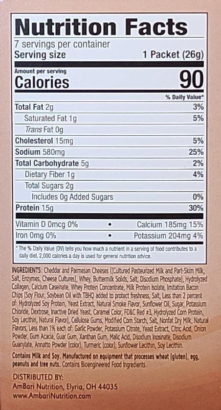 Enjoy the flavors of creamy cheddar and smoky bacon in our Bacon and Cheddar Cheese creamy soup, designed for low-calorie weight loss plans, and providing 15g protein and only 90 calories.