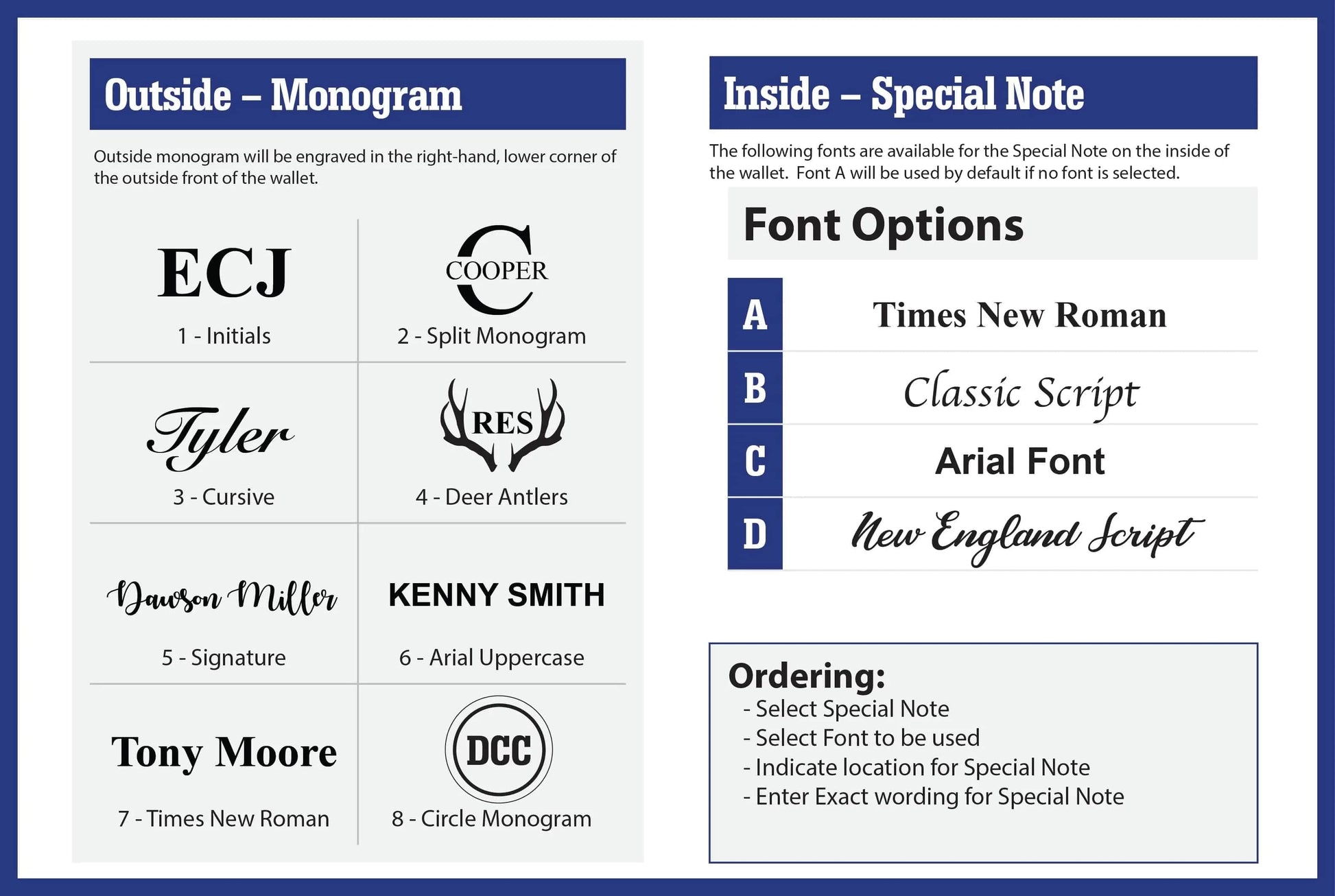 - Option to personalize your wallet on the right front bottom corner. Variety of designs available.