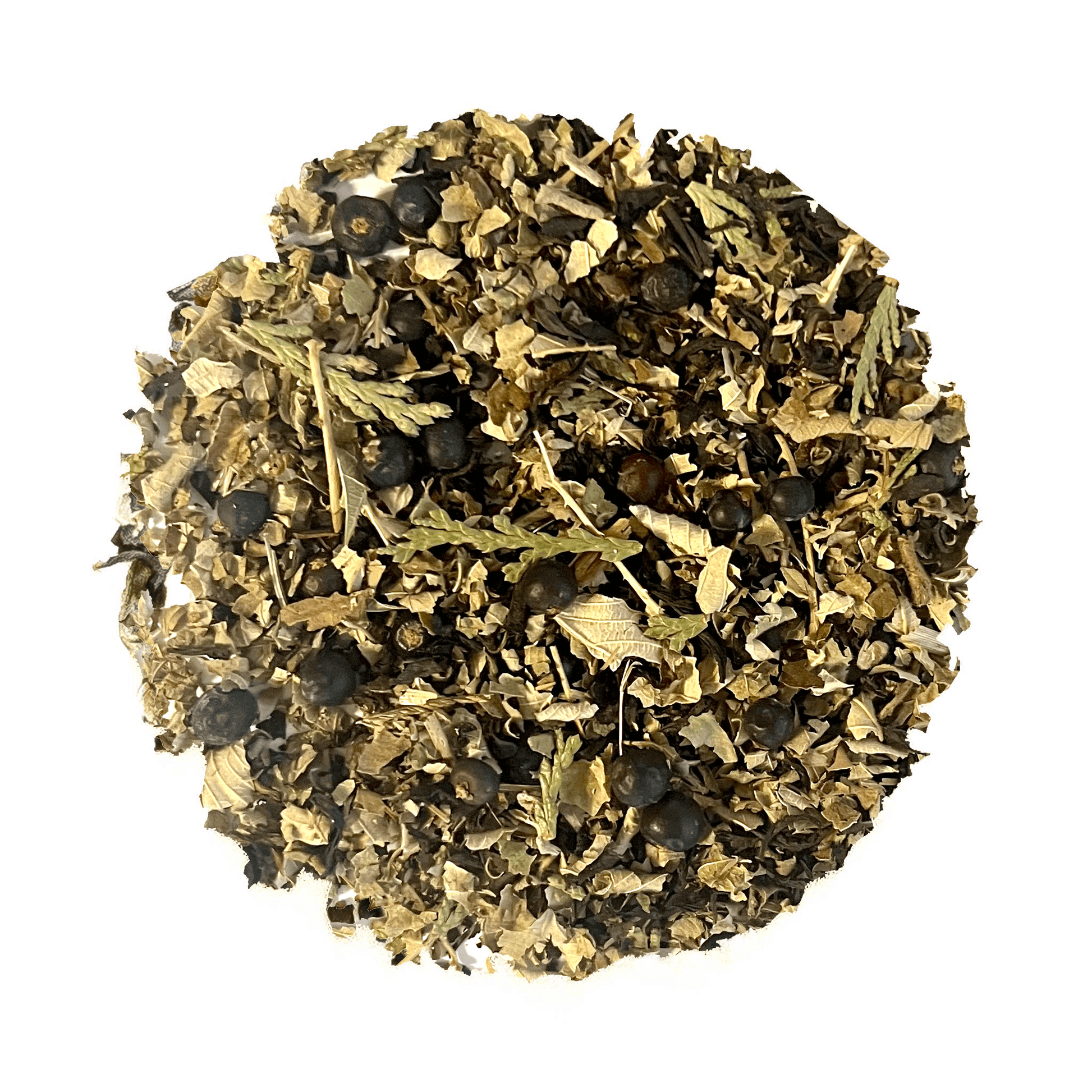 But that's not all – Beards Hollow Tea carries an added touch of the coastal uplands' woodland charm. Infused with wild foraged Western Hemlock needles and organic juniper berries, this tea evokes the serene beauty of the Pacific Northwest's forests. With each sip, you'll find yourself transported to a secluded hideaway amidst the woods, where the aroma of smoky fires and the essence of the forest dance in perfect harmony.