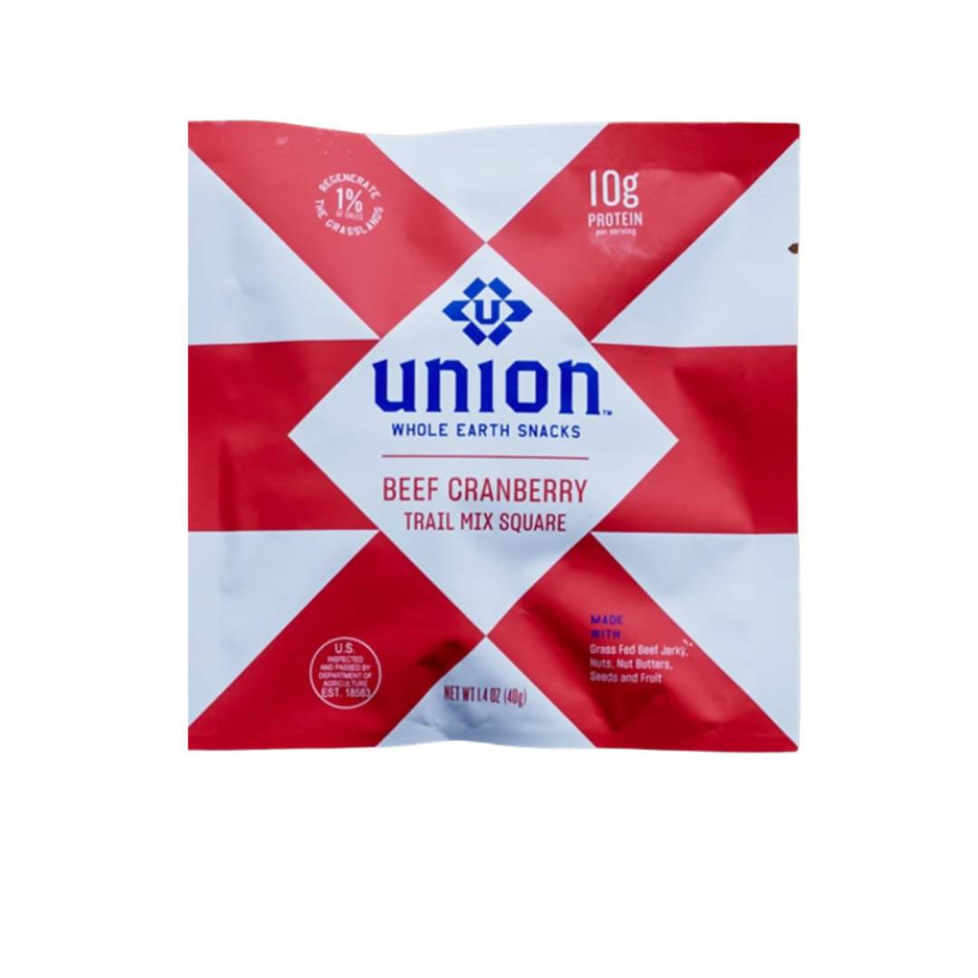 Union Snack’s Trail Mix Squares are a savory & sweet, multi-textured snack that combine regenerative meat jerky, nuts, nut butters, seeds and fruit. Our Beef Cranberry Square is a great mix of grass-fed beef and luscious cranberries with crunchy nuts and seeds for complex, unique deliciousness.