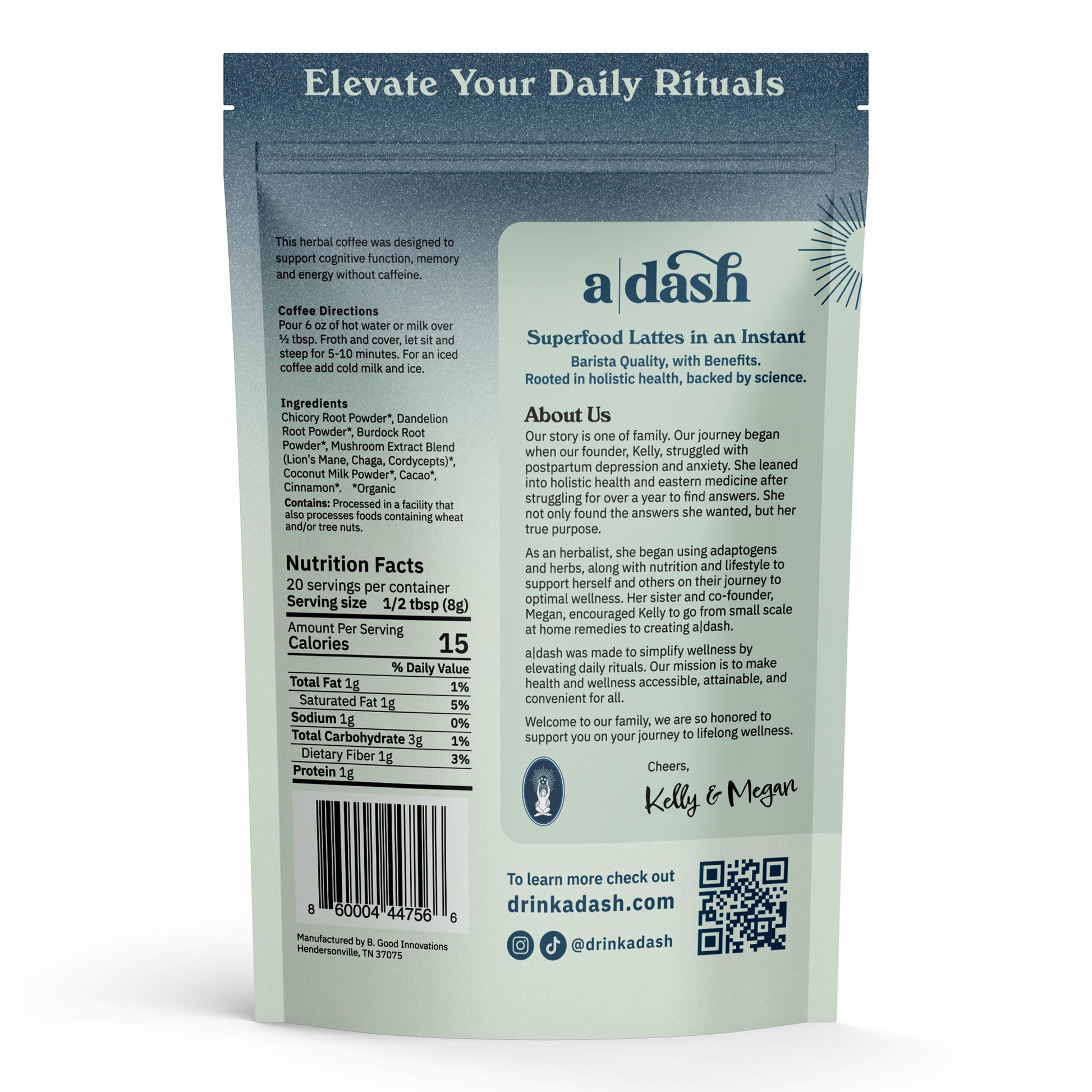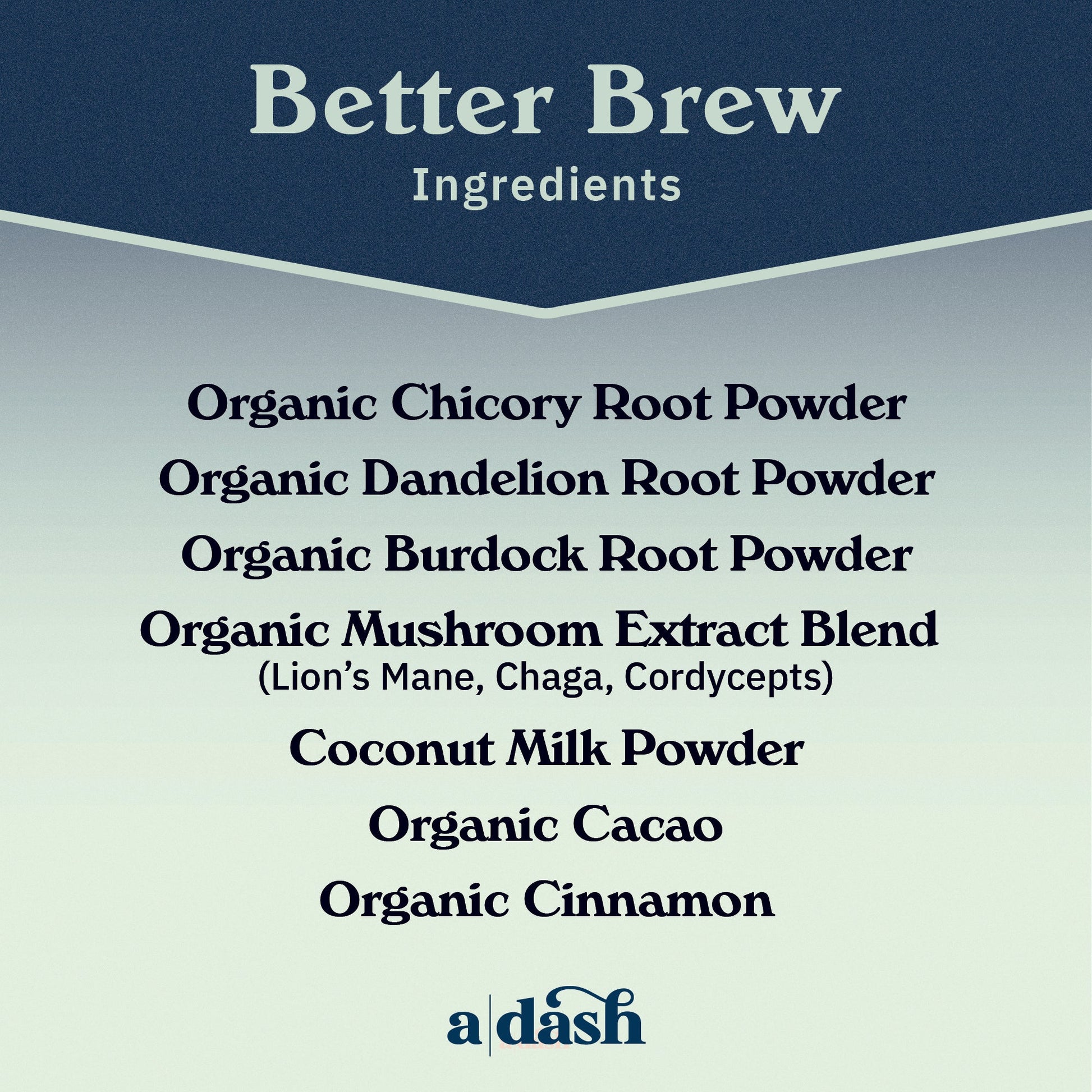 Ingredients: Chicory Root Powder, Dandelion Root Powder, Burdock Root Powder, Mushroom Extract Blend (Lions Mane, Chaga & Cordyceps), Coconut Milk Powder, Raw Cacao, Cinnamon (all ingredients used are organic*)