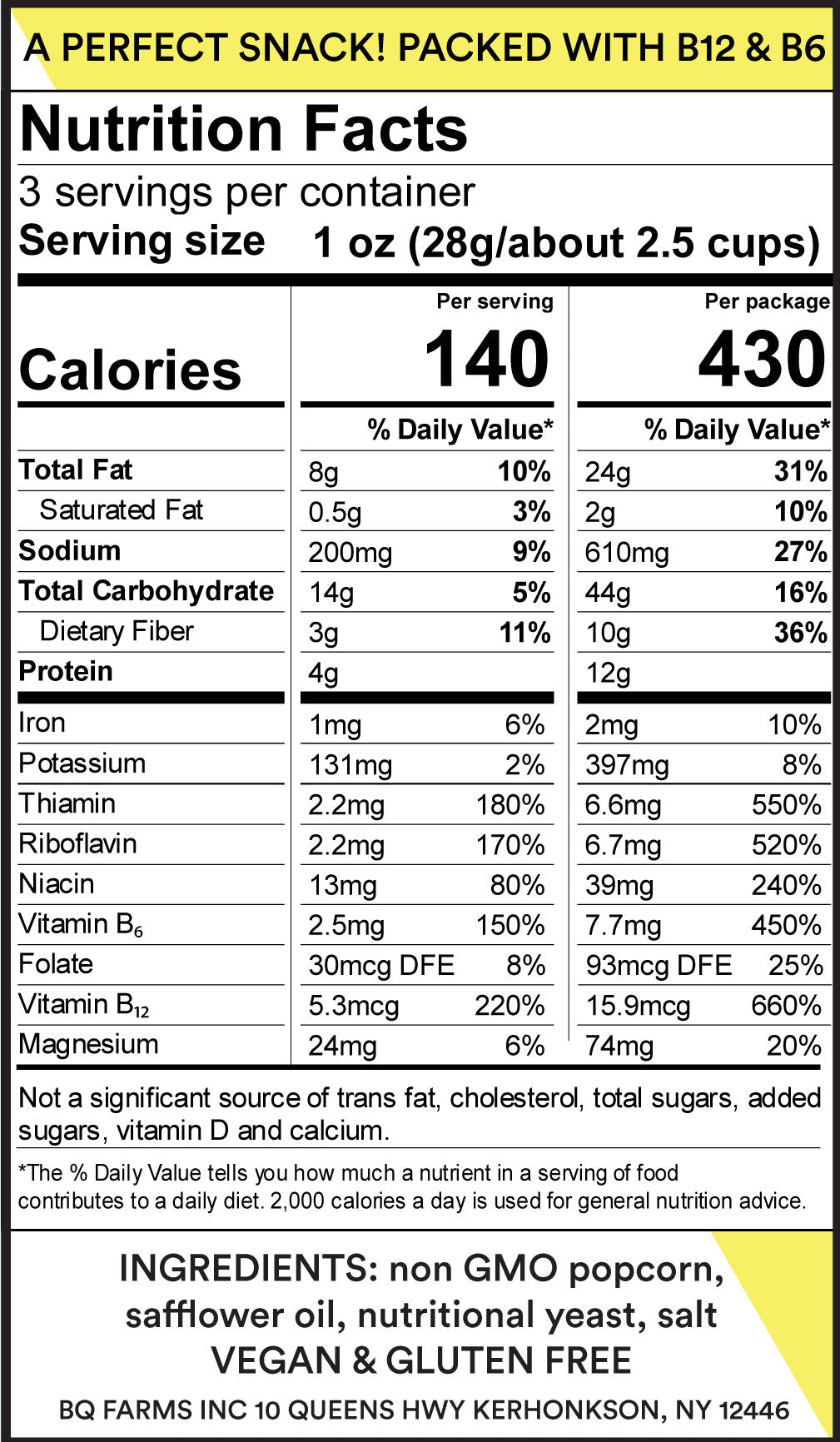 Ingredients: Non-GMO popcorn, Safflower Or Sunflower Oil, Nutritional Yeast, Salt