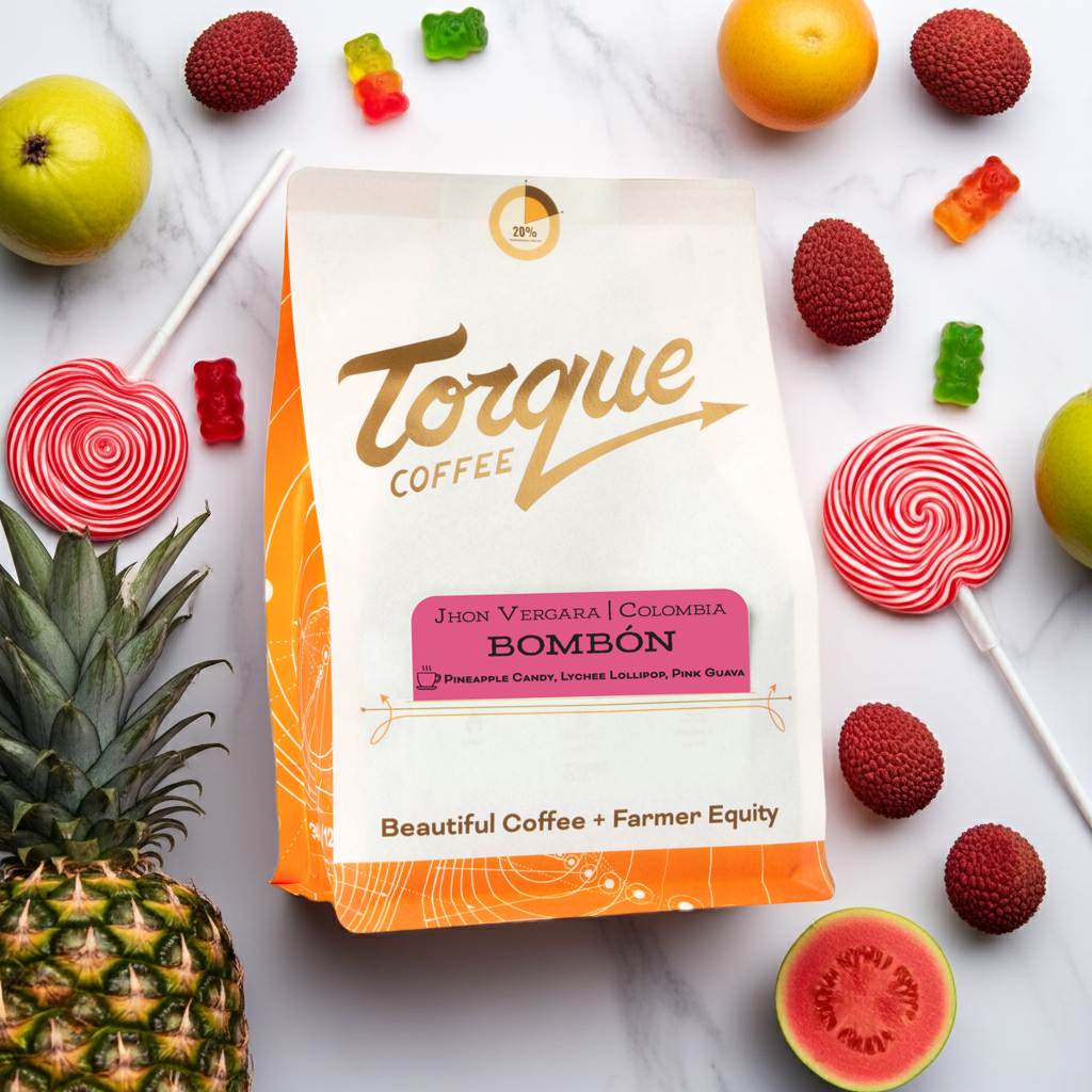 BomBón is our first custom coffee from the dynamic duo that lead the Peñas Blancas coffee mill project in Colombia. Jhon Vergara and Nestor Lasso have made a worldwide name for themselves with radical experimental coffee processing. Their coffees have been winners in every global coffee, barista and roasting competition for years. They have achieved great success in bringing anaerobic, yeast and fruit inoculated and co-fermented coffees to market.
