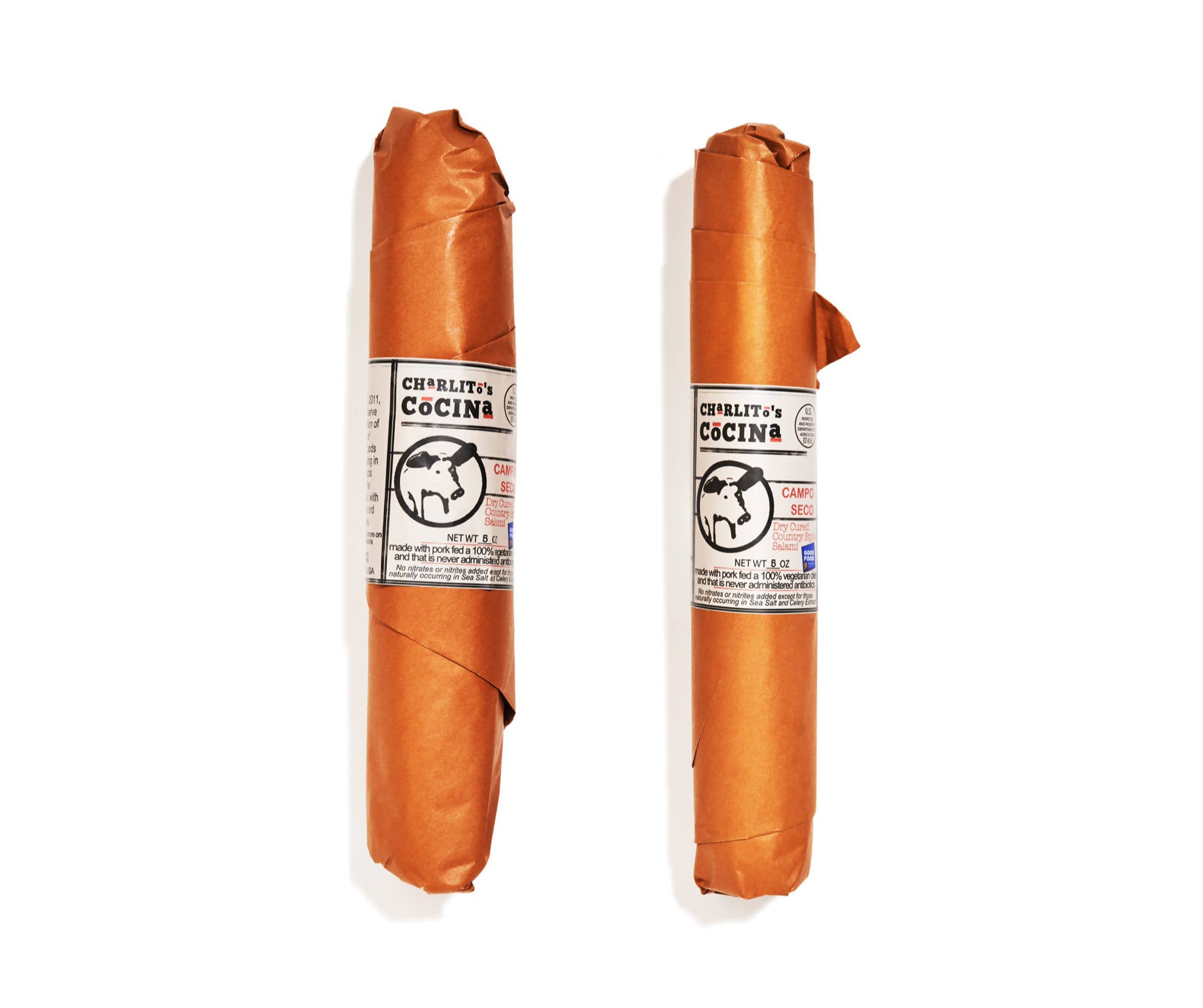 Charlito's Cocina's Campo Seco is made with Sustainably raised pork, hand-harvested, solar evaporated sea salt. Earthy and rustic, sophisticated, yet totally accessible, “Campo Seco” a dry-cured salami made simply with heritage breed pork and hand-raked sea salt. Intended to demonstrate the power of simple, excellent ingredients, Campo Seco is versatile and long-lasting, pairing deliciously with a wide variety of cheeses, fruits, and condiments. It is also a graceful complement to pasta, risotto, or scrambled eggs, to name a few. Take me to a party or take me home (I don’t mind if it’s just you and me) Try me with your favorite wine; I’m flexible! For those who appreciate the simple things, this charcuterie is there for you.