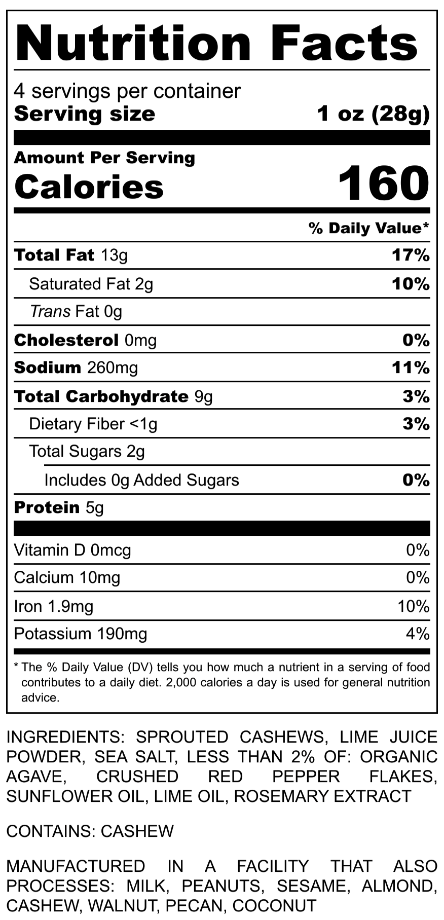 Sprouted cashews, lime sea salt (sea salt, lime powder), sea salt, less than 2% of: organic agave, crushed red pepper flakes, sunflower oil, lime oil, rosemary extract