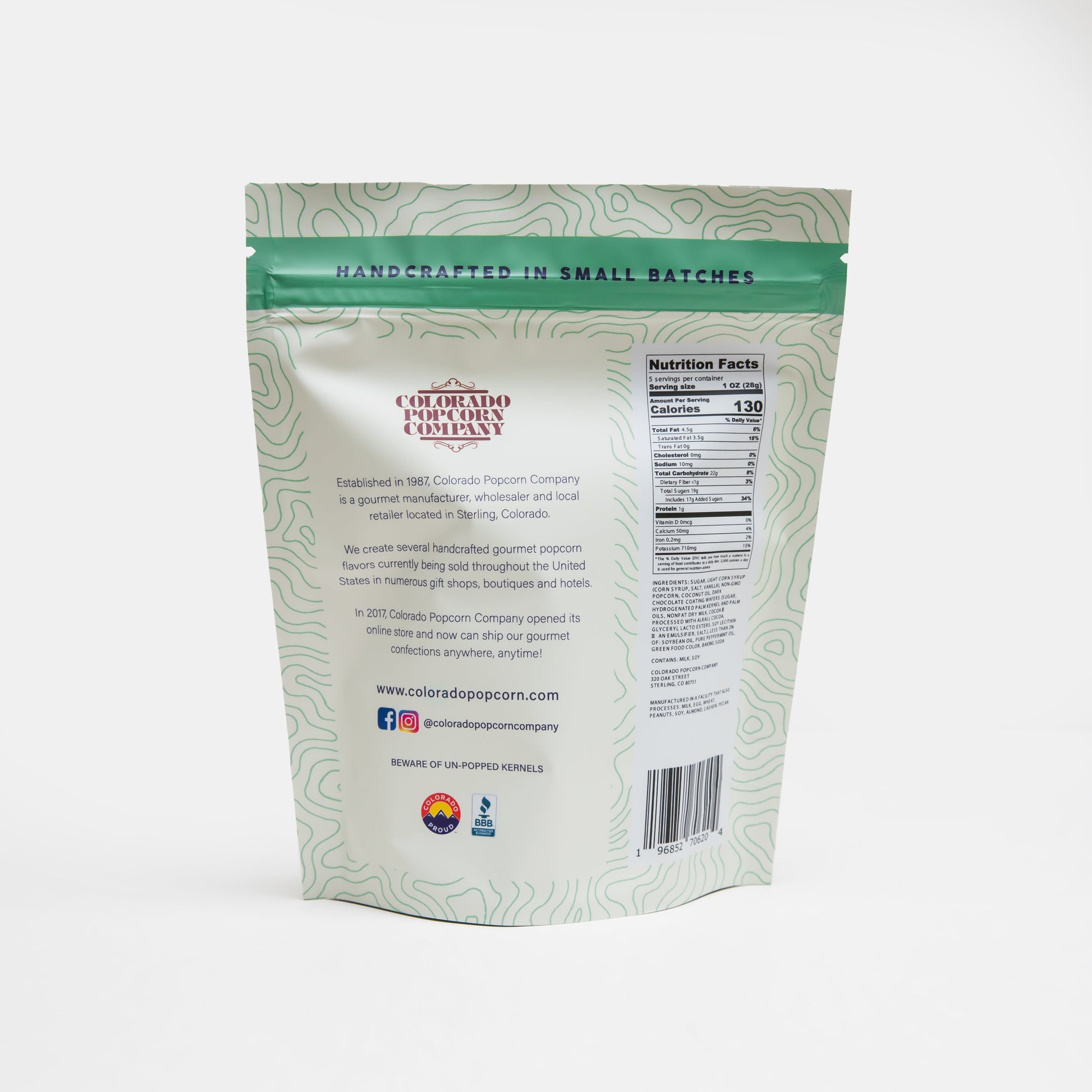 A bag of our Chocolate Mint popcorn. Peppermint flavor candied popcorn with dark chocolate drizzle. Uniquely tasty!