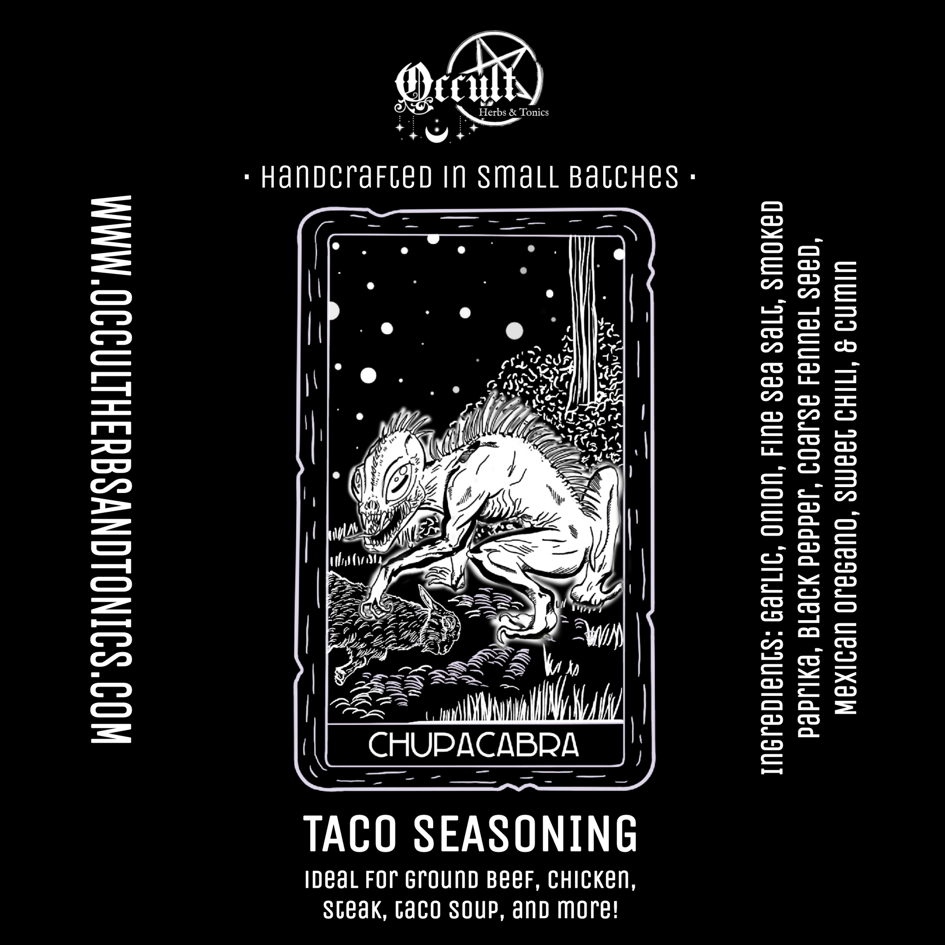 Born of borderland folklore, the Chupacabra brings a bite that’s anything but ordinary. Smoky paprika, Mexican oregano, garlic, and onion unite with crushed fennel seed, sea salt, and black pepper to create a seasoning that’s rich, savory, and just a little wild. Summon it on taco night, dust it over grilled meats, or let it stalk your roasted vegetables—the Chupacabra is always hungry for more flavor.