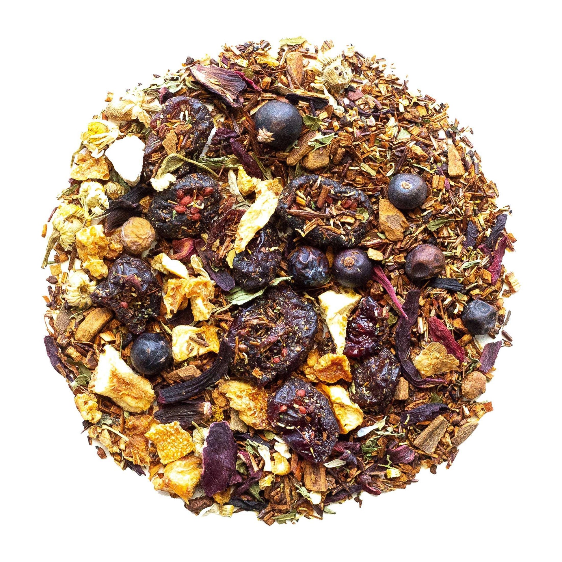 Blended with red rooibos, juniper berries, and zesty orange peels, this tea is designed to immerse you in the holiday spirit. With undertones of chicory and hibiscus and a delightful kick of cinnamon, you'll be surprised by the smooth and calming twist of chamomile that envelopes your senses.