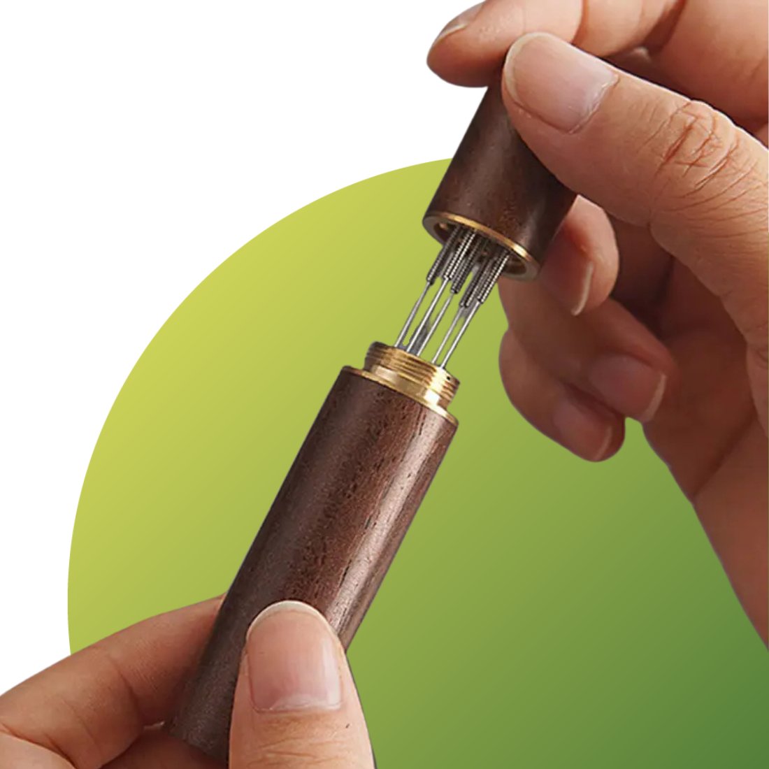 Achieve café-quality espresso at home with our premium espresso coffee distribution tool. Expertly crafted from solid wood and stainless steel, this precision tool ensures an even coffee bed for consistent extraction and perfect crema. The ergonomic handle provides comfort and control, while fine, aligned needles evenly distribute your grounds before tamping — preventing channeling and improving every shot.