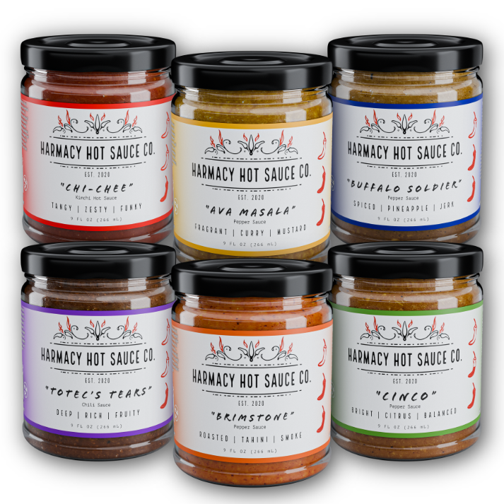 The Core Lineup Variety Pack is the ultimate way to experience everything Harmacy Hot Sauce has to offer. This complete set includes all six flavors: Brimstone Rimjob (roasted red pepper & tahini), Totec’s Tears (dried chili & plum), Cinco (tomatillo & clementine), Buffalo Soldier (grilled pineapple jerk), Chi-Chee (fermented kimchi), and Avamasala (curry mustard). From bright citrus to smoky chilis, tangy mustard to funky fermentation, this collection covers the full range of bold, balanced, and unique flavor profiles that set Harmacy apart. Perfect for hot sauce lovers, gourmet foodies, and gift-giving, the Core Lineup Variety Pack is handcrafted in small batches, vegan, gluten-free, nut-free, and proudly award-winning. Discover why Harmacy is flavor first, unique taste, with balanced heat!