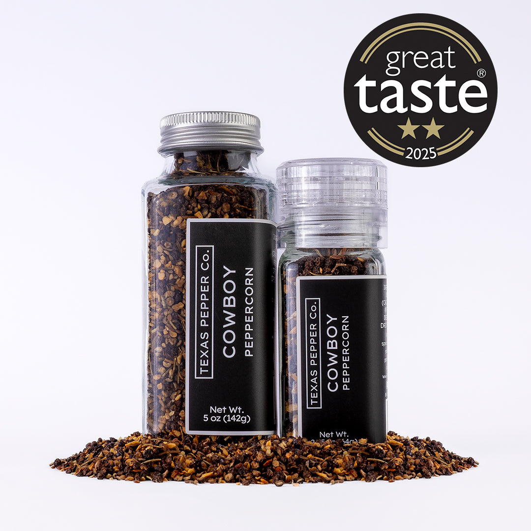 Smoke up your next meal with Cowboy Peppercorn! Our all-natural blend pepper is made with cracked black peppercorn, dried garlic, and dried rosemary for an intense, smoky flavor. Includes a convenient grinder for a perfect finish every time. Give your taste buds something to talk about!
