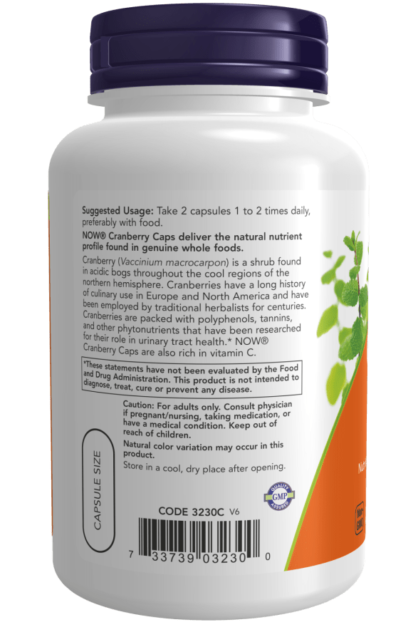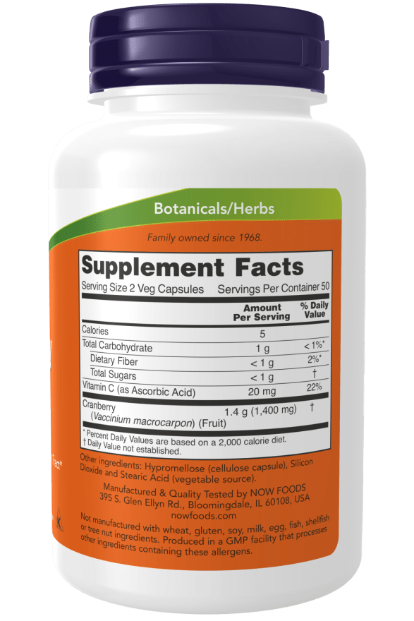 Cranberry (Vaccinium macrocarpon) is a shrub found in acidic bogs throughout the cool regions of the northern hemisphere. Cranberries have a long history of culinary use in Europe and North America and have been employed by traditional herbalists for centuries. Cranberries are packed with polyphenols, tannins, and other phytonutrients that have been researched for their role in urinary tract health. NOW® Cranberry Caps are also rich in vitamin C.