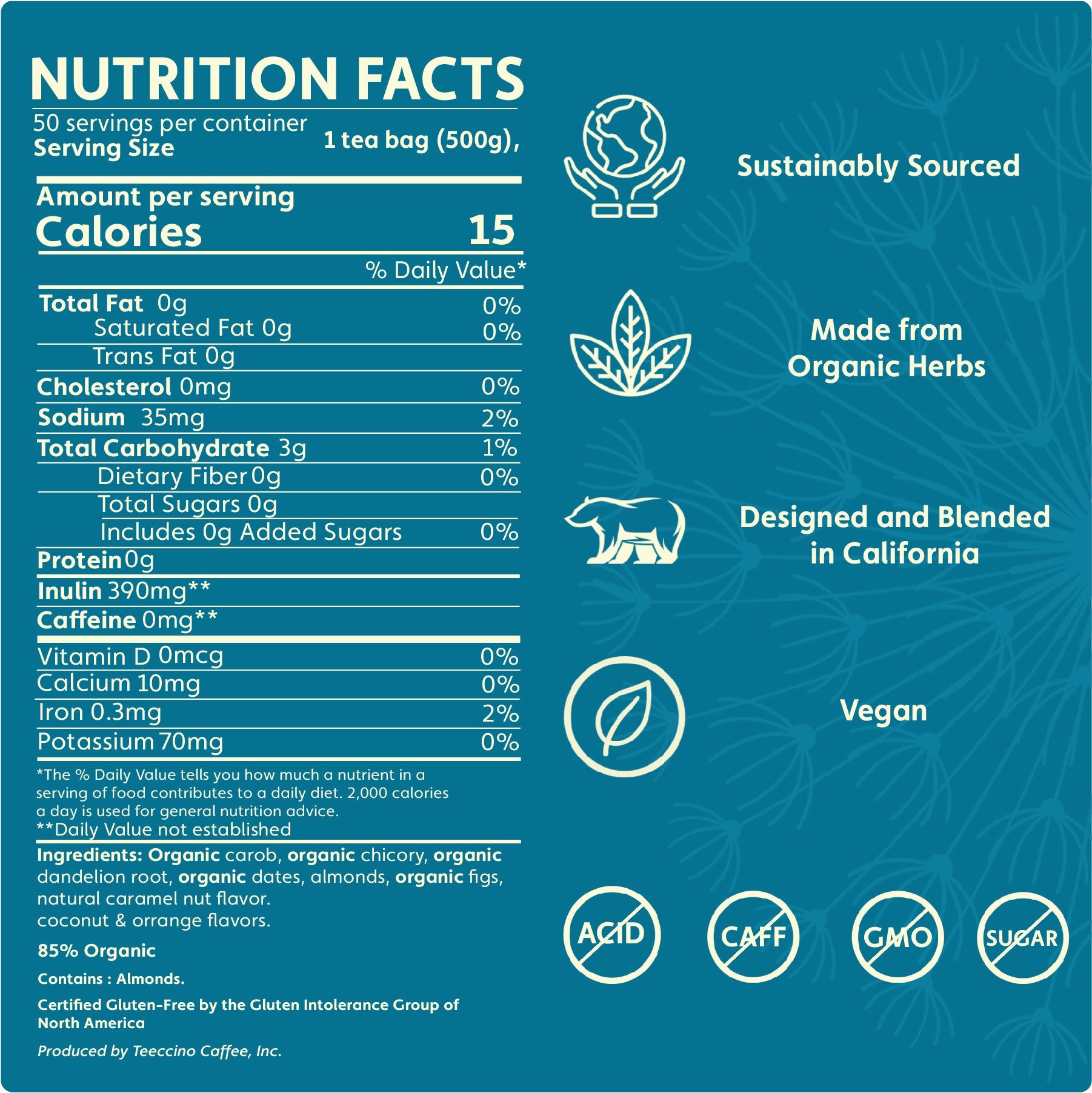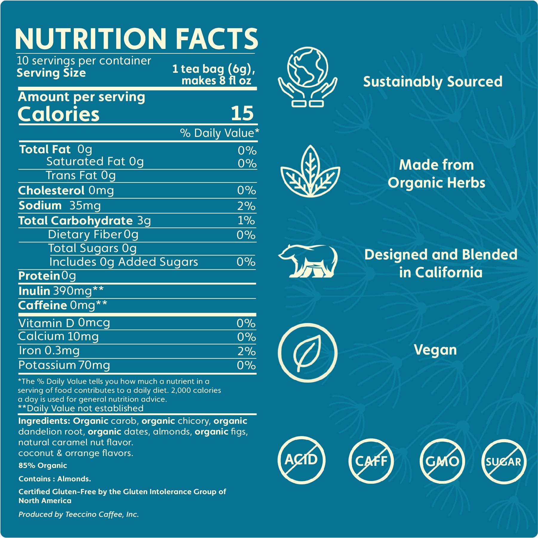 Treat yourself to a swirl of sweet and creamy caramel against roasted dandelion and chicory roots, enhanced by dates, figs and almonds.