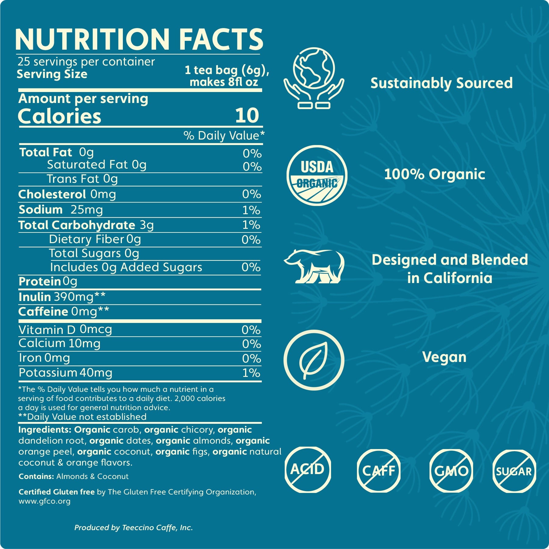 Nutty shredded coconut adds warmth to deep roasted dandelion and chicory roots; plus a spike of orange peel and the sweetness of dates and figs