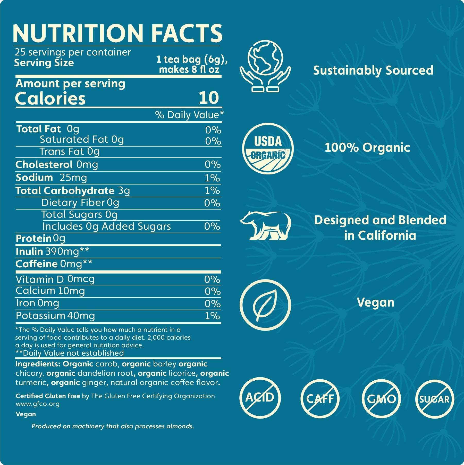 Zesty turmeric and ginger highlight roasted dandelion and chicory roots with stimulating bitters, sweetened by licorice root.