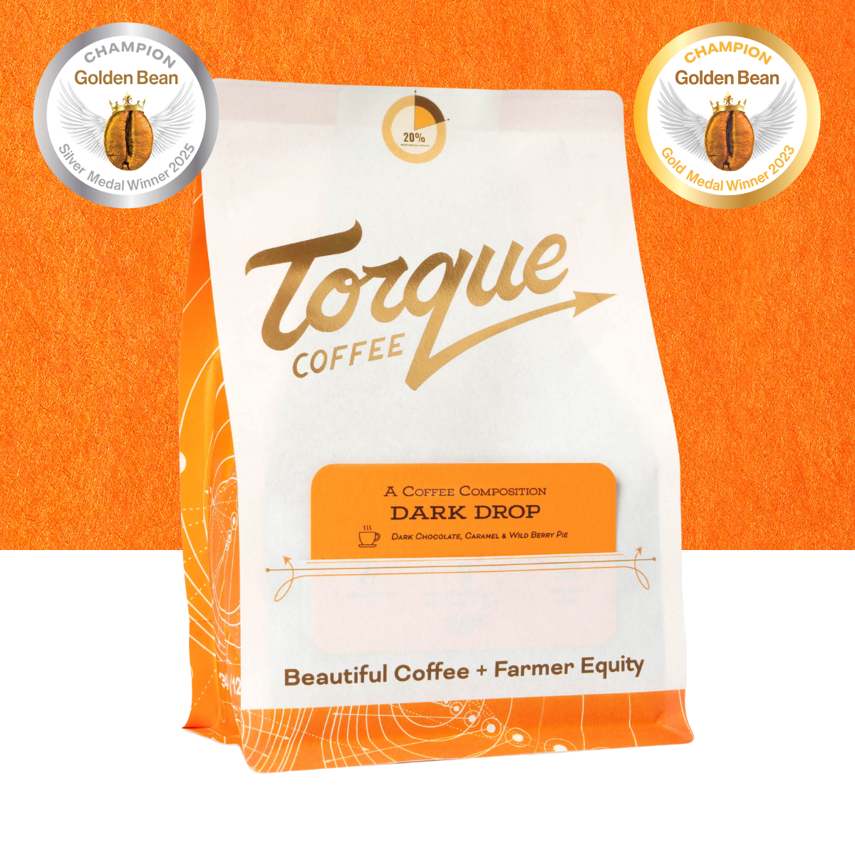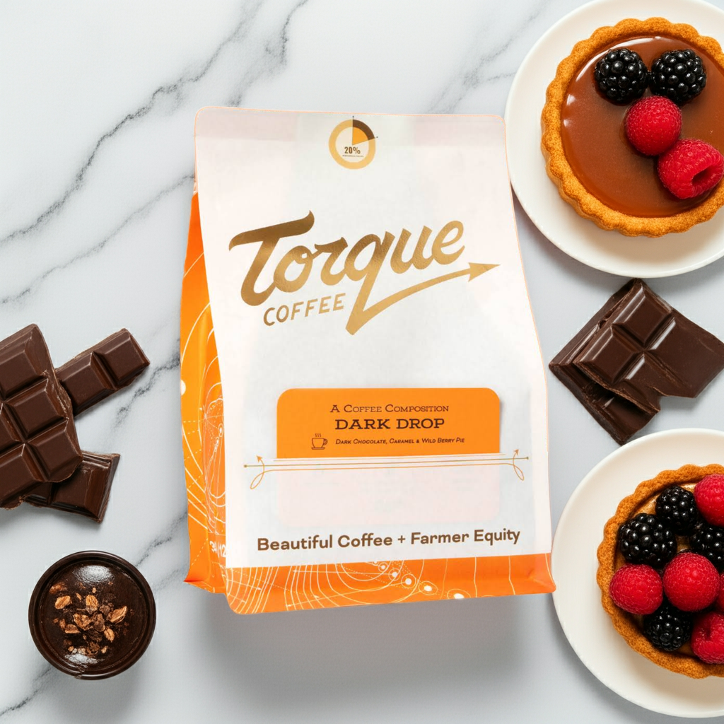Dark Drop offers a sensory journey of dark chocolate, cherries, and berries galore. It's an experience akin to youthful energy mingled with the wisdom of darkness, delivering a bag of exquisite dark chocolate and dark purple fruit flavors. This Gold Medal-winning blend boasts a sweet, balanced profile with just the right touch of bitterness, just warm, developed sugars and a glorious mouthfeel. It's a sweet dark chocolate berry pie party for your taste buds.