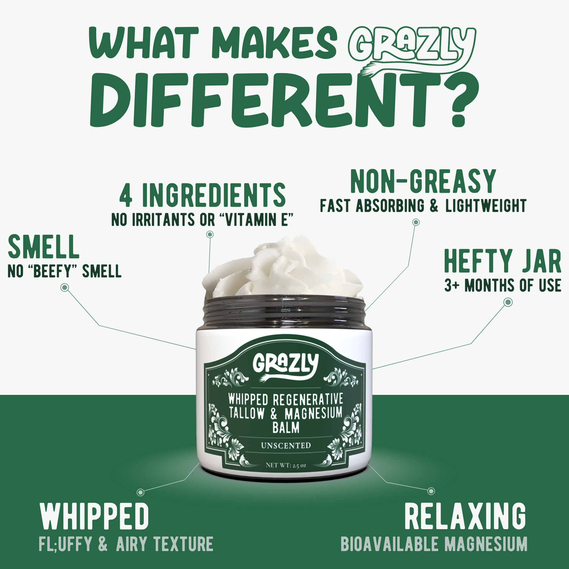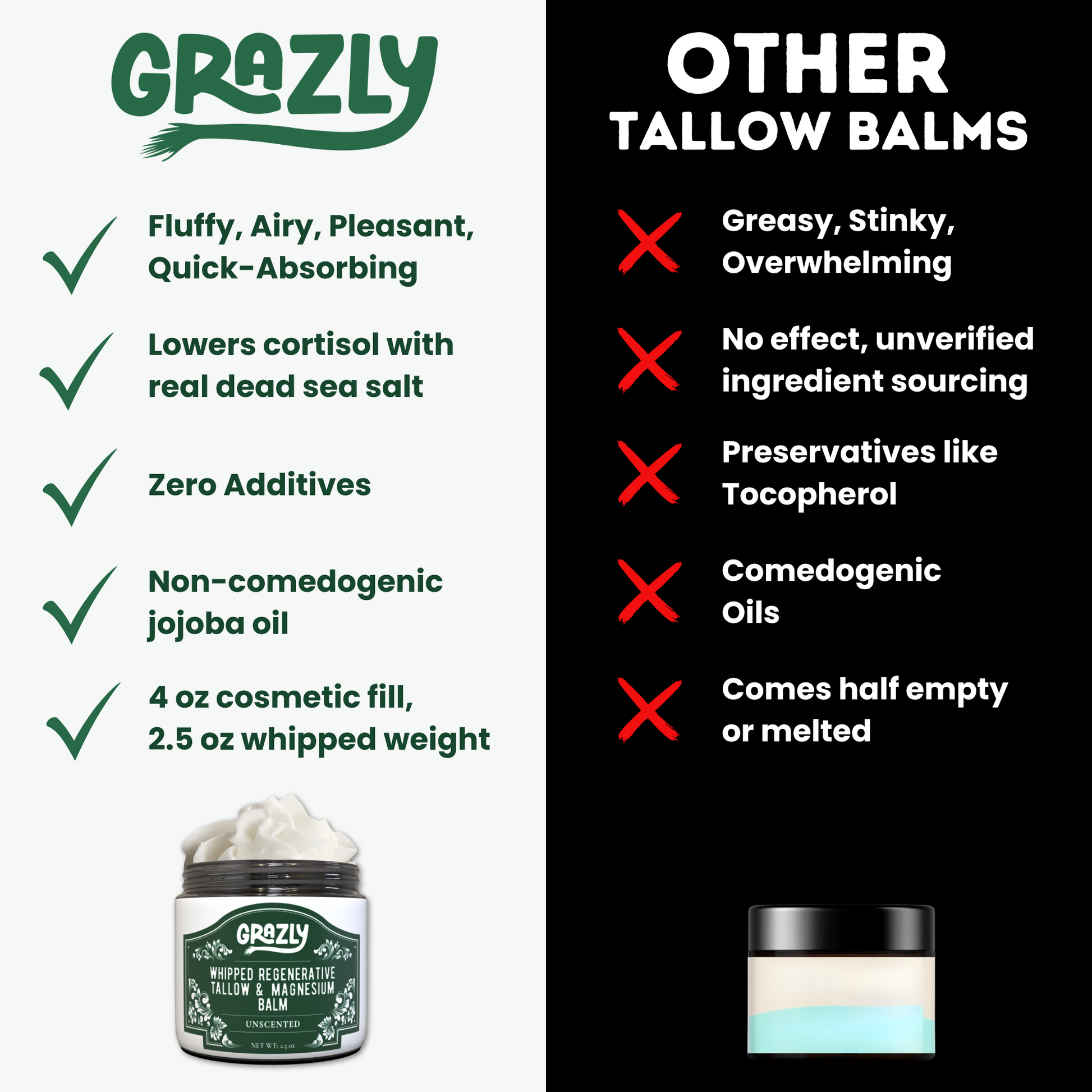 Rich in sleep-supporting minerals and bioavailable nutrients, our 2.5 oz Dead Sea Magnesium Tallow Balm combines 100% grass-fed beef tallow with naturally-occurring magnesium chloride for superior transdermal absorption and faster sleep onset.