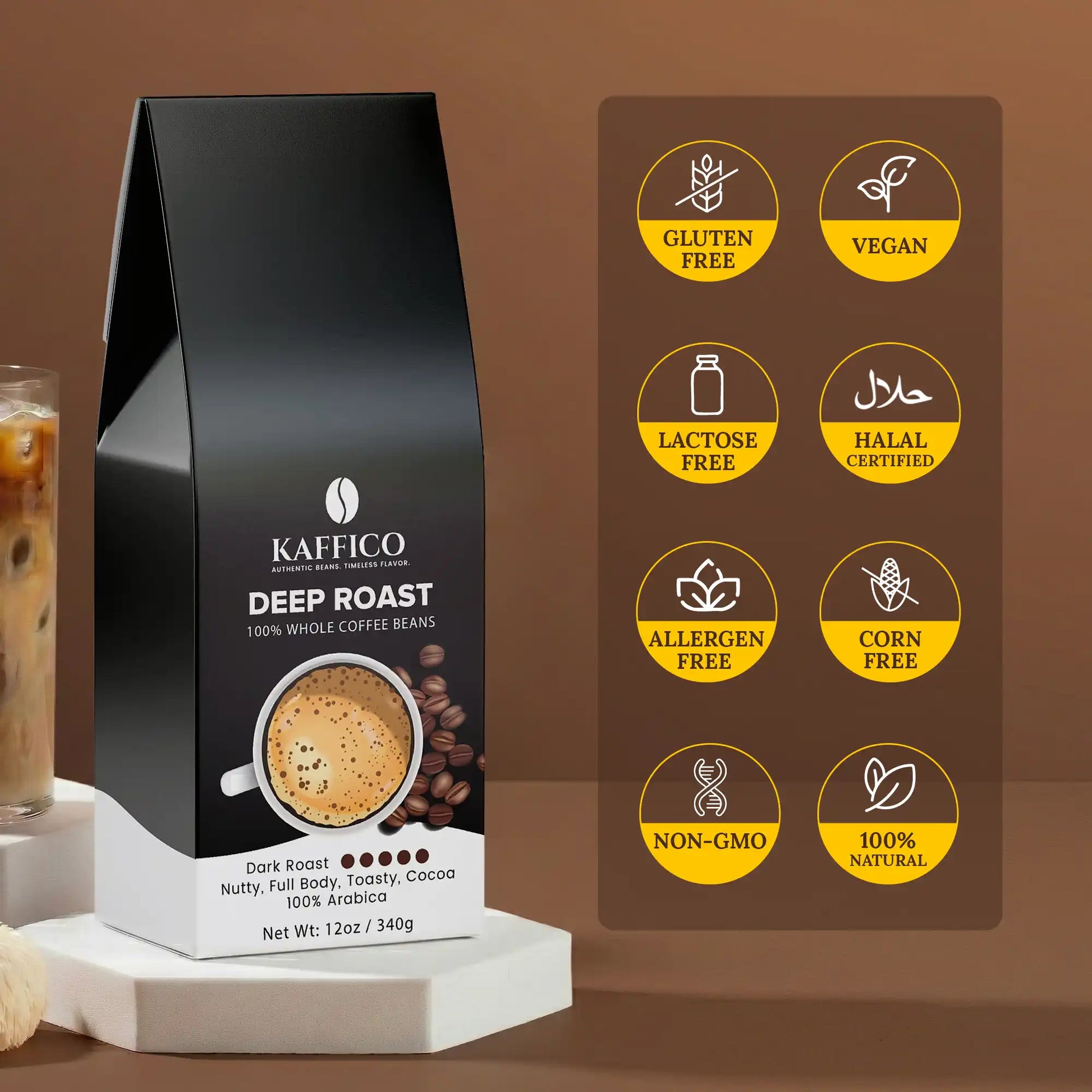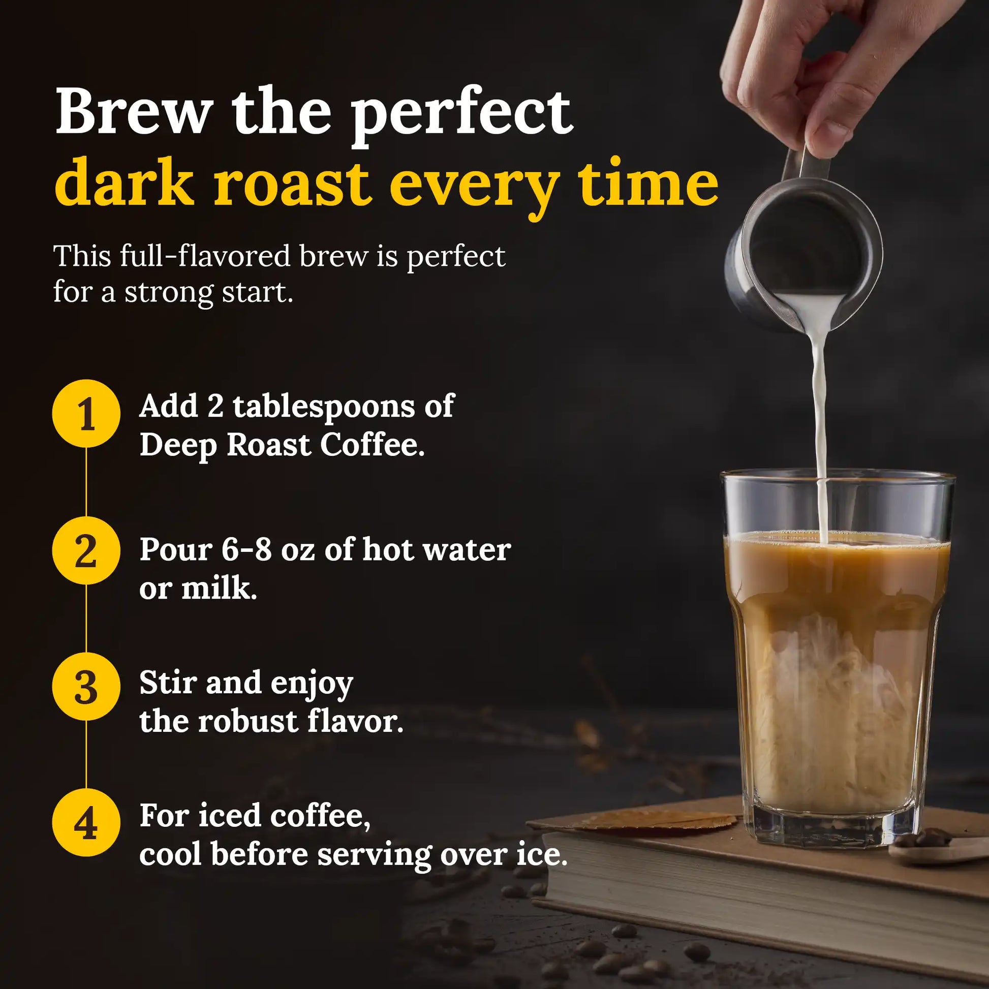 Premium Arabica beans and a dark roast create a bold, smooth, and balanced cup with deep flavor and drinkability.