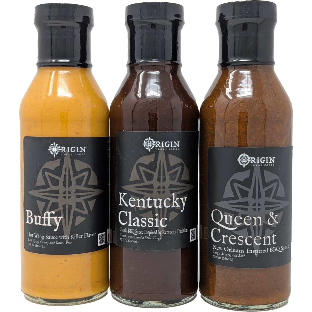 A box containing one bottle each of Buffy, Kentucky Classic, and Queen and Crescent. This variety box covers all your dipping sauce needs, and gets you a $5 discount on the set of 3!