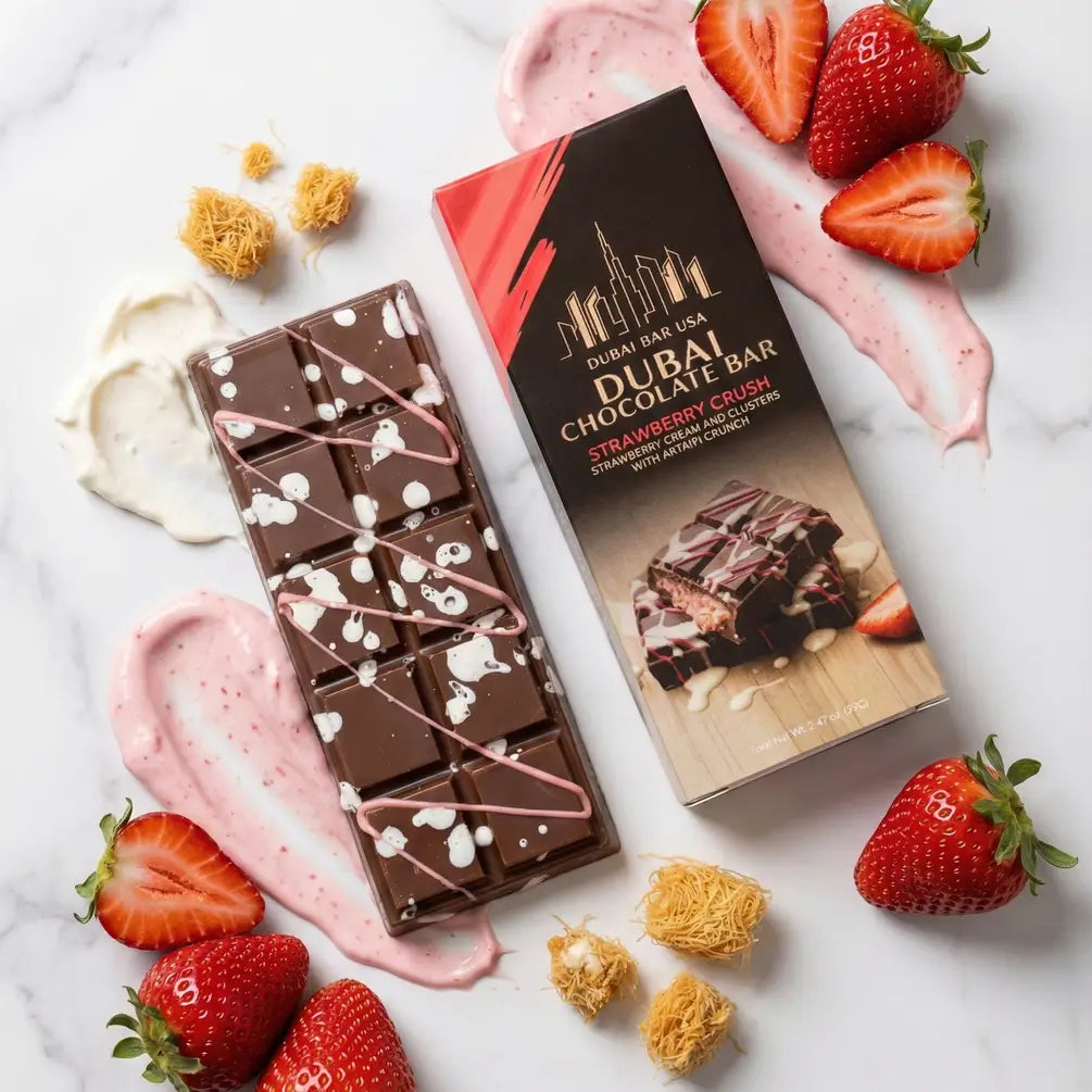 Introducing the Dubai Bar - Strawberry Crush, now available direct from the source. After producing over 1 million Dubai Bars as a top white label manufacturer, we have officially launched our own brand, Dubai Bar USA.