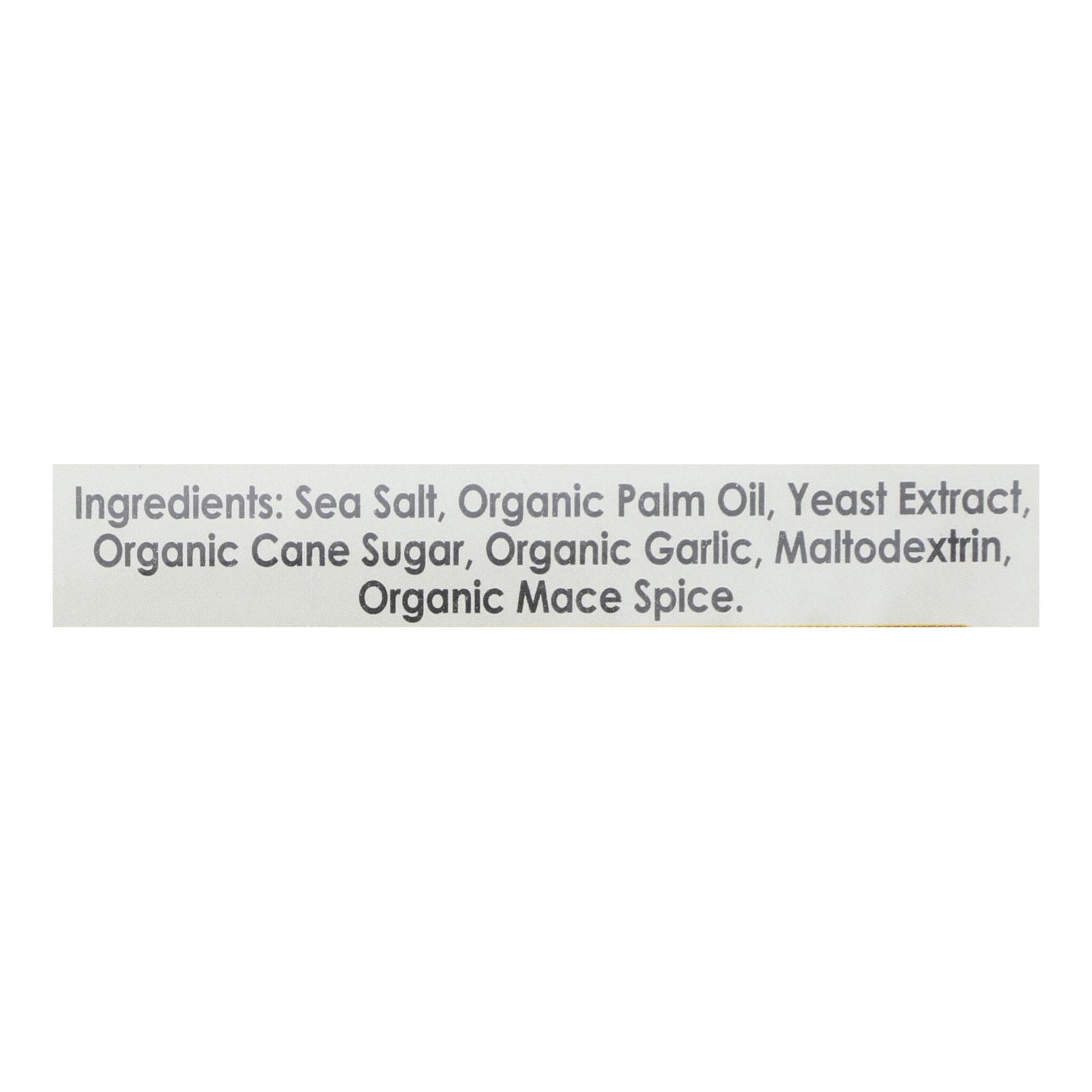 - Key Ingredients: Sea salt, organic palm oil, yeast extract, organic cane sugar, organic garlic, maltodextrin, organic mace spice