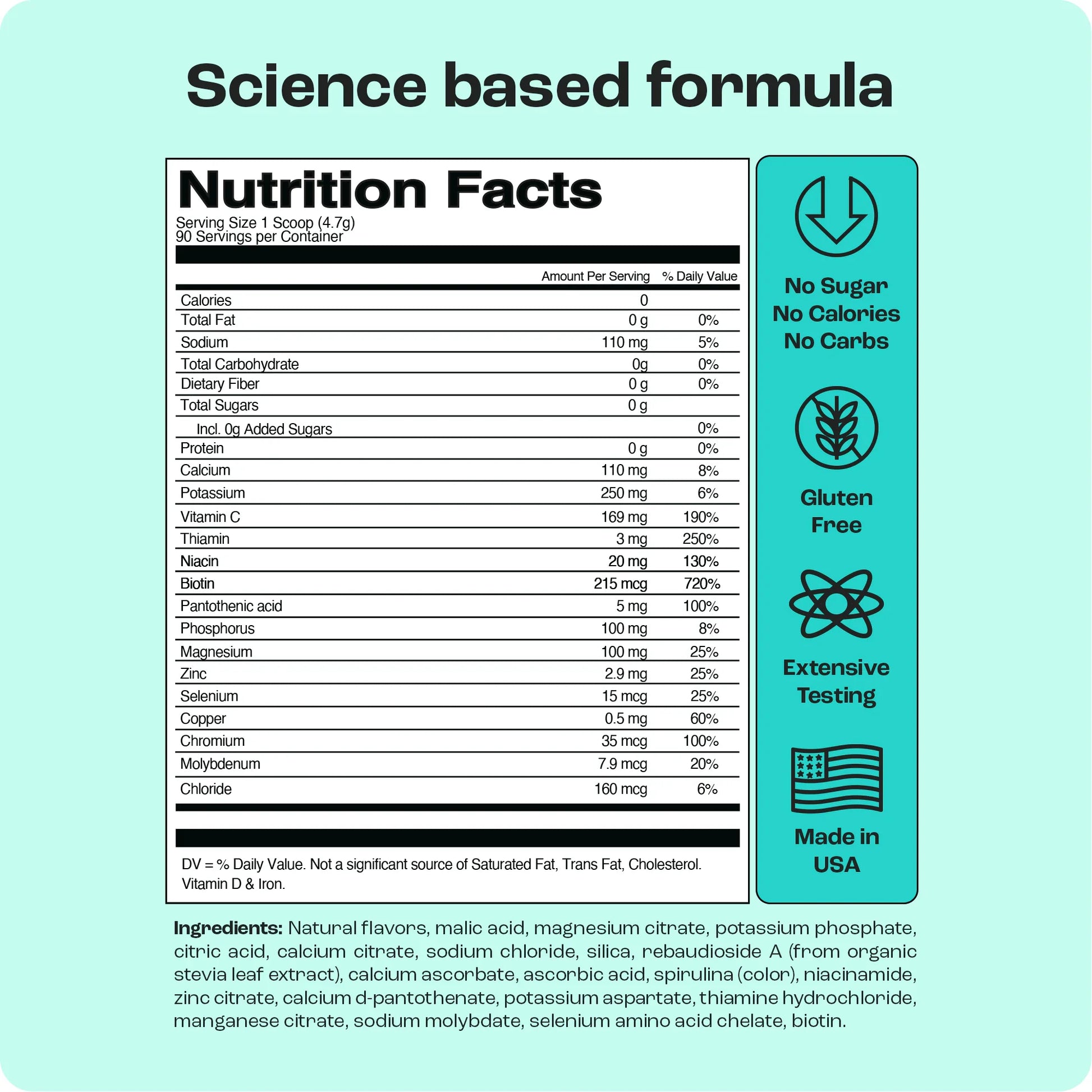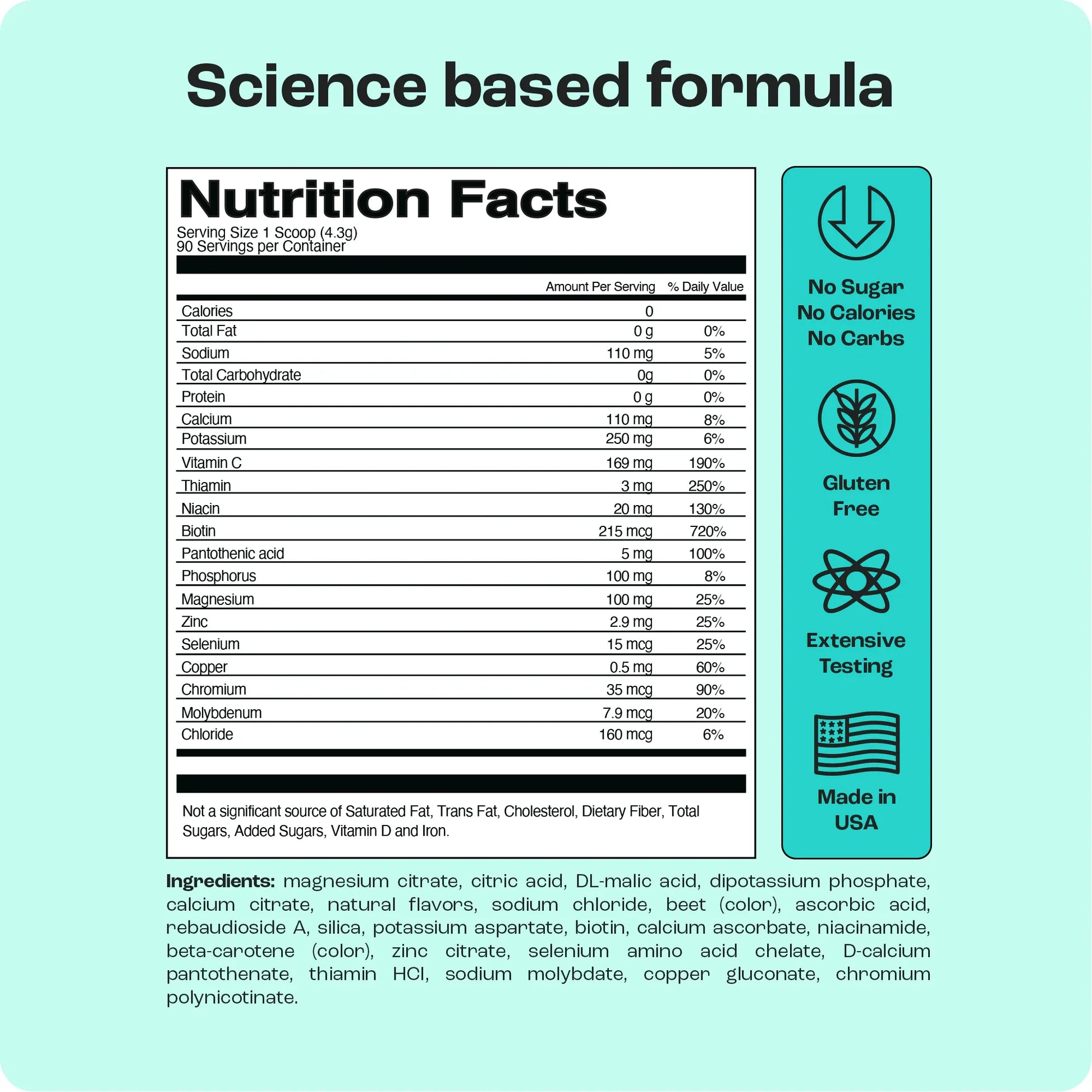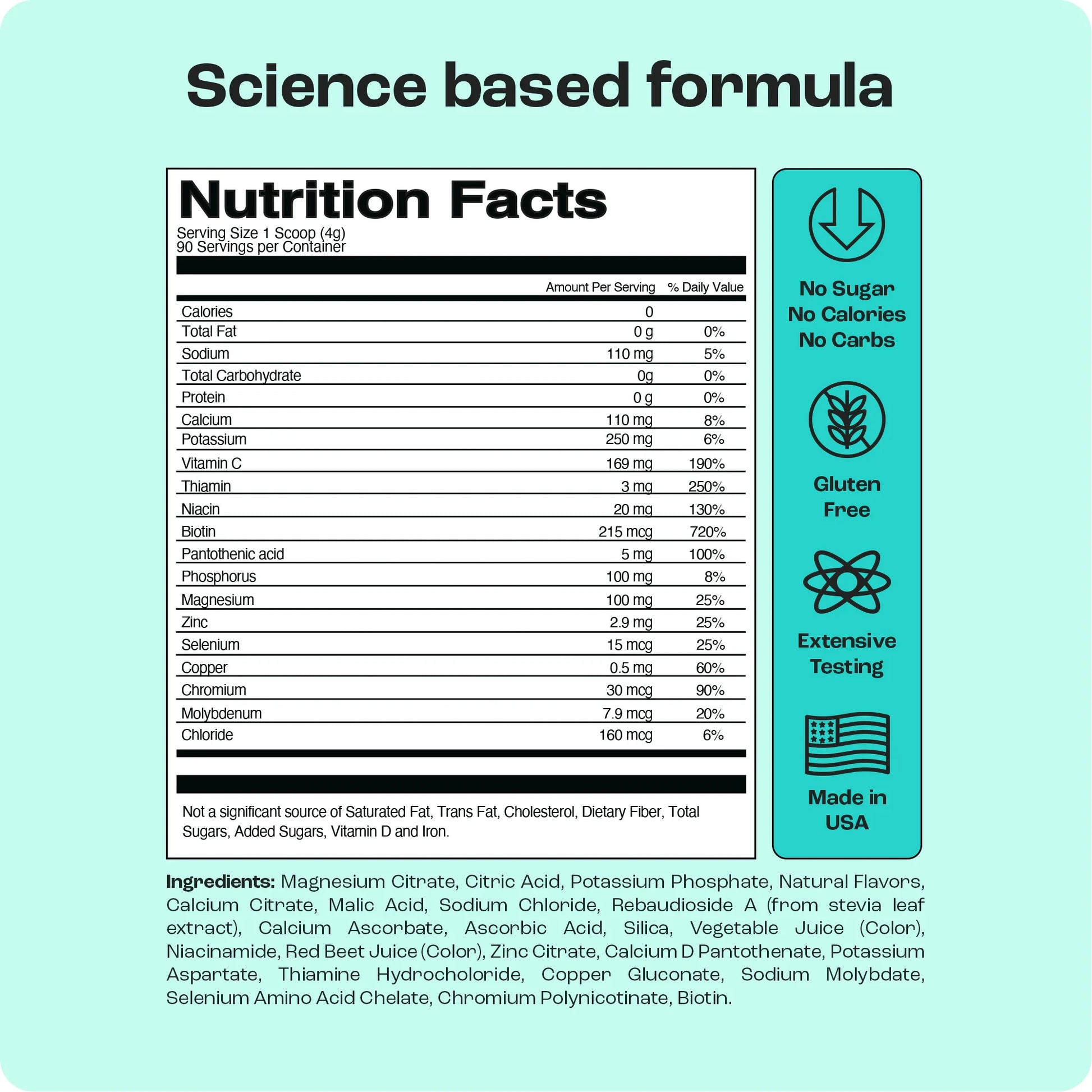 - Electrolytes You Can Trust - Hydrate your body, regulate nerve & muscle function and rebuild damaged muscle tissue with 6 key electrolytes: Magnesium, Potassium, Calcium & more. Enriched with 12 additional vitamins, this electrolyte mix drink is free from artificial colors and sweeteners.