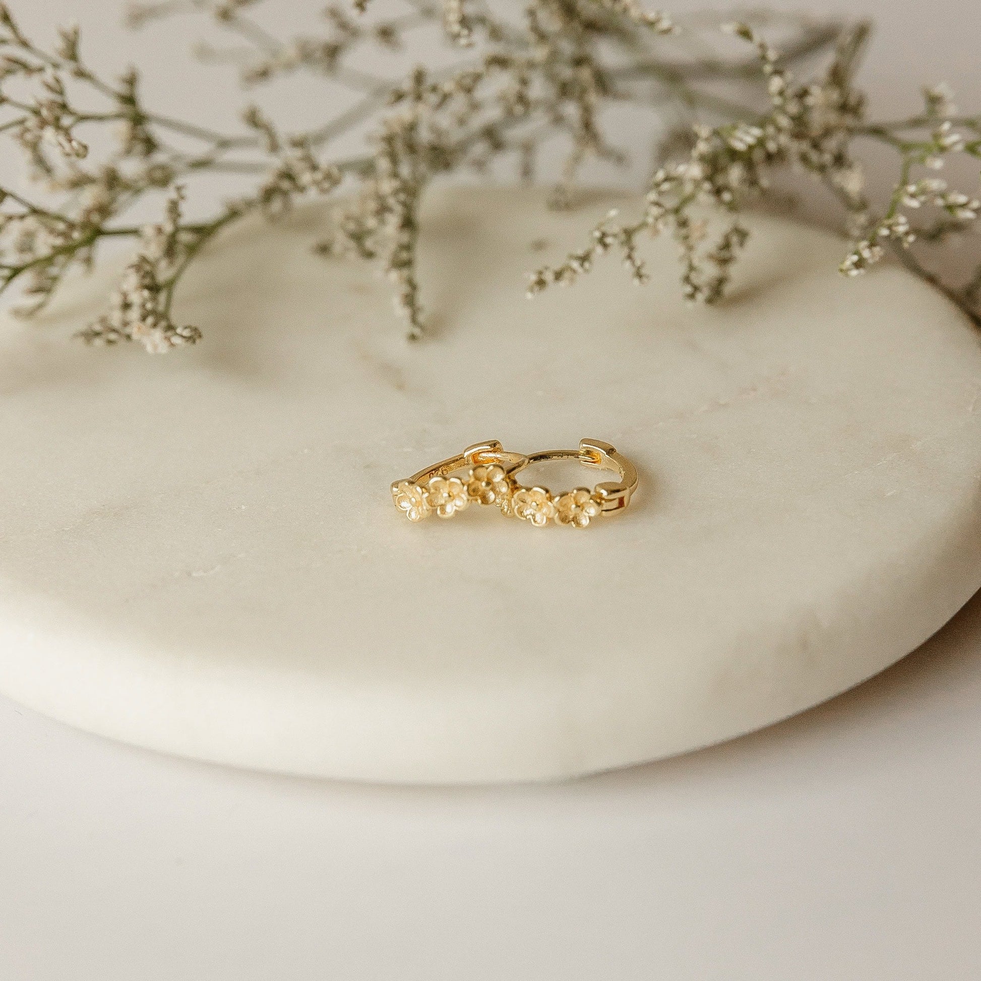 *Note model is wearing the Everyday Hoop Earrings in her first piercing and the Flower Huggie Hoops in her second piercing.