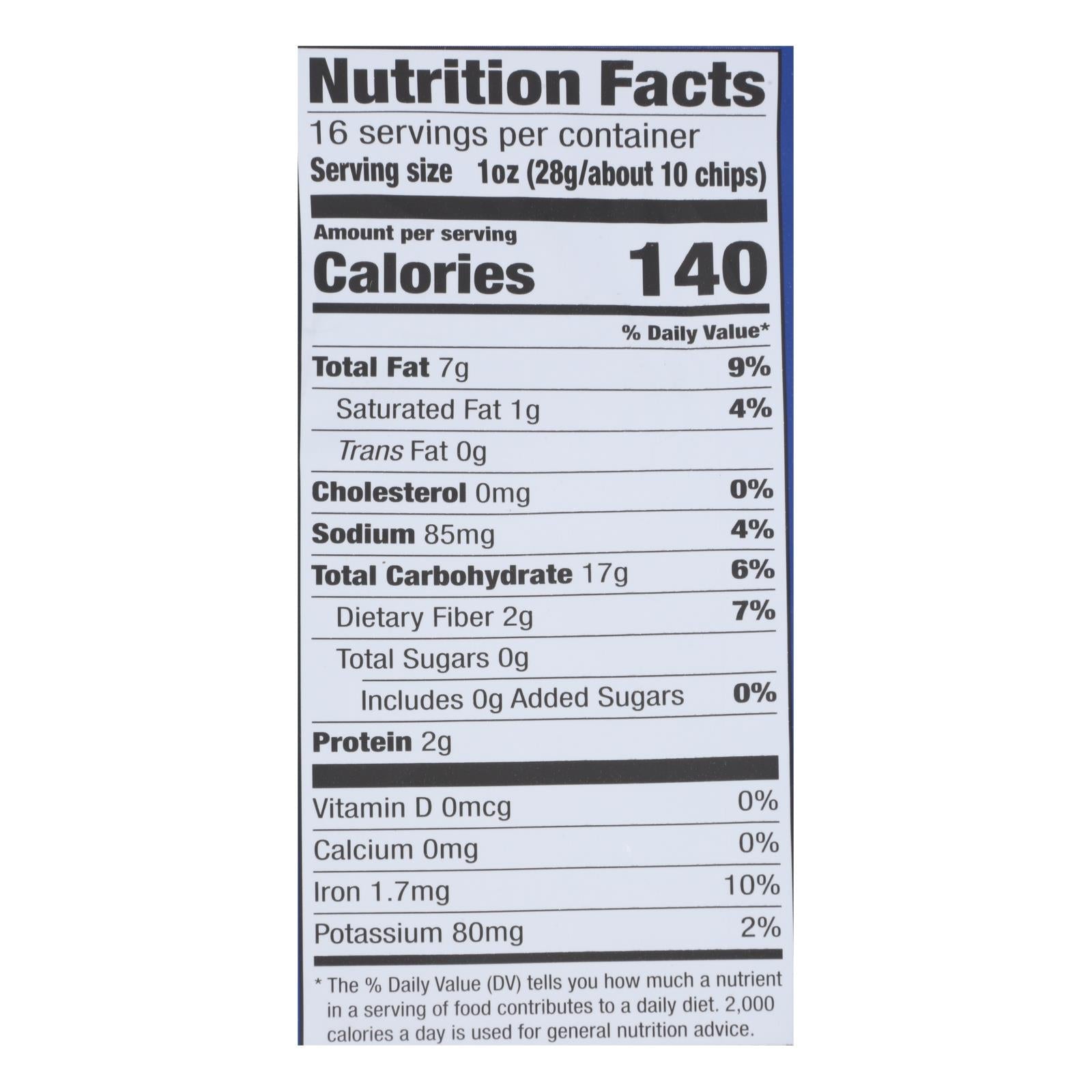 Delight in the rich flavor and satisfying crunch of these blue corn tortilla chips. Each chip is crafted from organic whole corn kernels and cooked in expeller-pressed oils, ensuring a wholesome snack that's not only delicious but also free from genetically modified ingredients and artificial additives. Perfect for those with dietary preferences, these chips are: