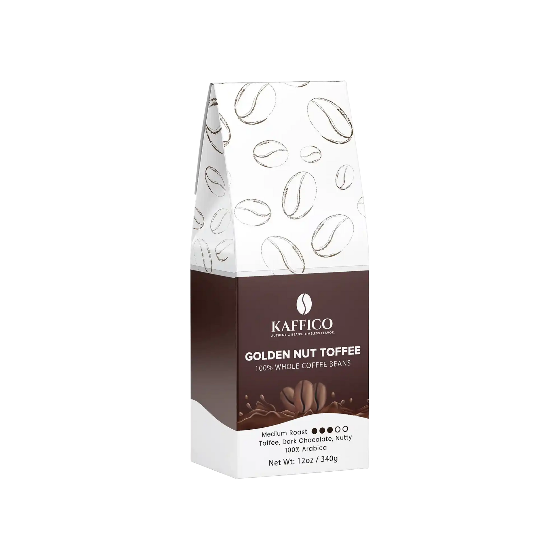 Kaffico Golden Nut Toffee Coffee has low to medium acidity, making it smooth and easy on the palate. It’s perfect for those who prefer a less acidic cup.