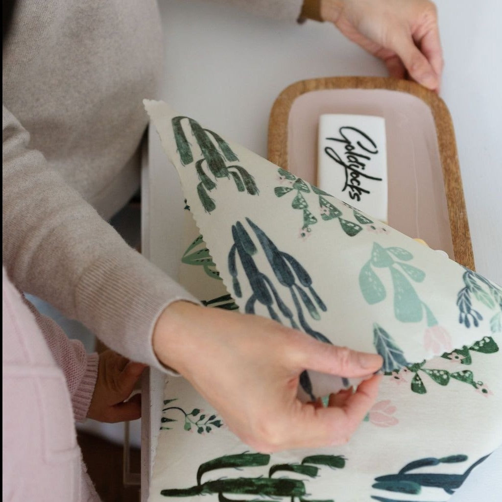 Goldilocks Goods Beeswax Food Wraps: Cacti Set of 3 by Goldilocks Goods wholesale product delivery near me | | Fulfilled by our friends at Goldilocks GoodsGood for your food. Good for the earth.lasts 1 year · keeps food fresher · compostableThe average person uses over 2000 sq. ft. of plastic wrap every year. Join the more than 50,000 people who have made the switch from plastic to Goldilocks Wraps.An all natural, reusable & eco-friendly alternative to plastic wrap in the kitchen. Wash in cool, soapy water. Do not heat. A fun and youthful set, for the joyful gardener, plant enthusiast or the one who dreams of escaping to the desert sun.Set of 3 IncludesLarge 11x14" | Medium 10x10" | Small 6x9"Ingredients100% Cotton | Canadian Beeswax | Tree Rosins | Jojoba OilMade by hand in Victoria, BC.