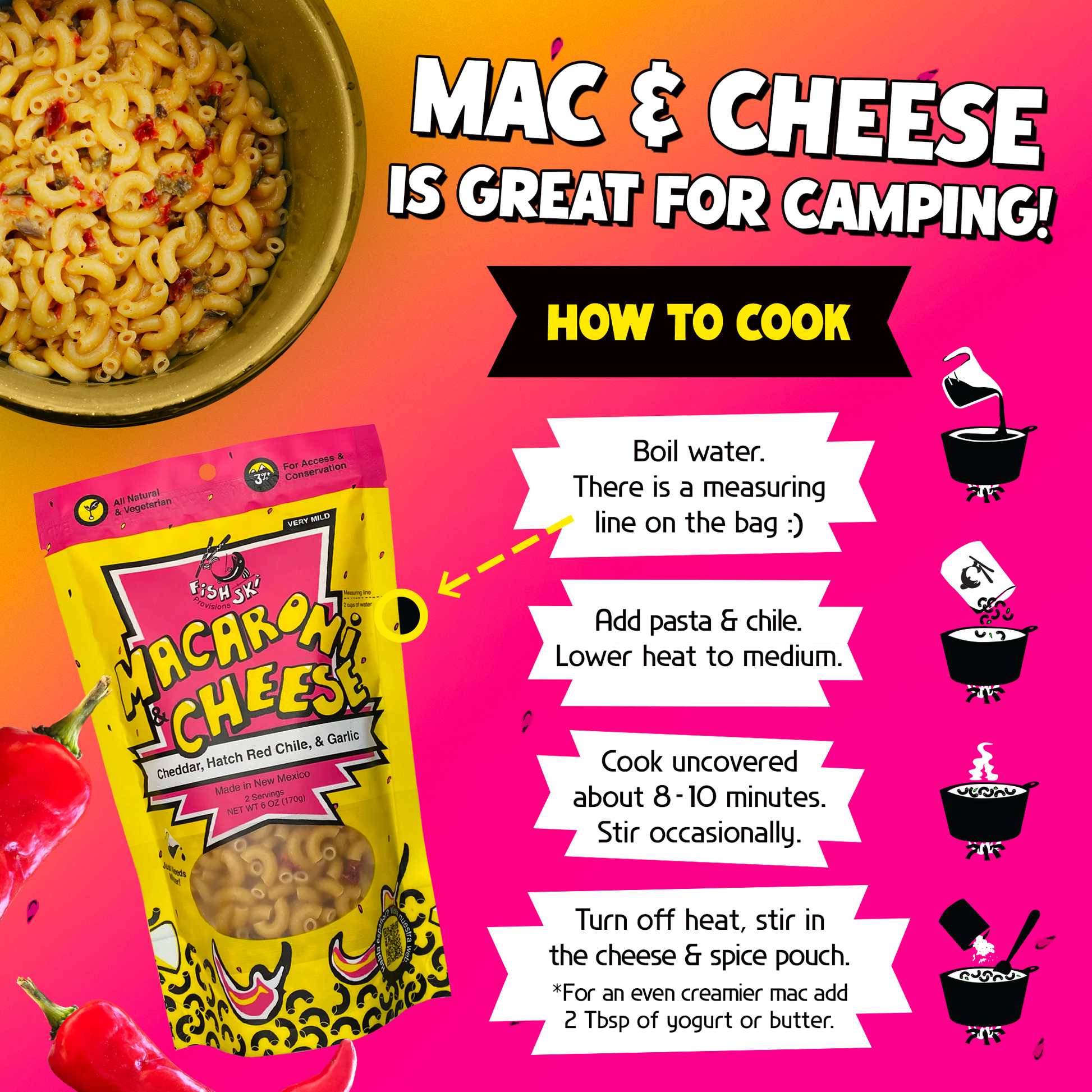 To make our mac and cheese all you need to do is boil 2 cups of water with the pasta and peppers. When all the water is absorbed, add the cheese and spice mix and stir vigorously.