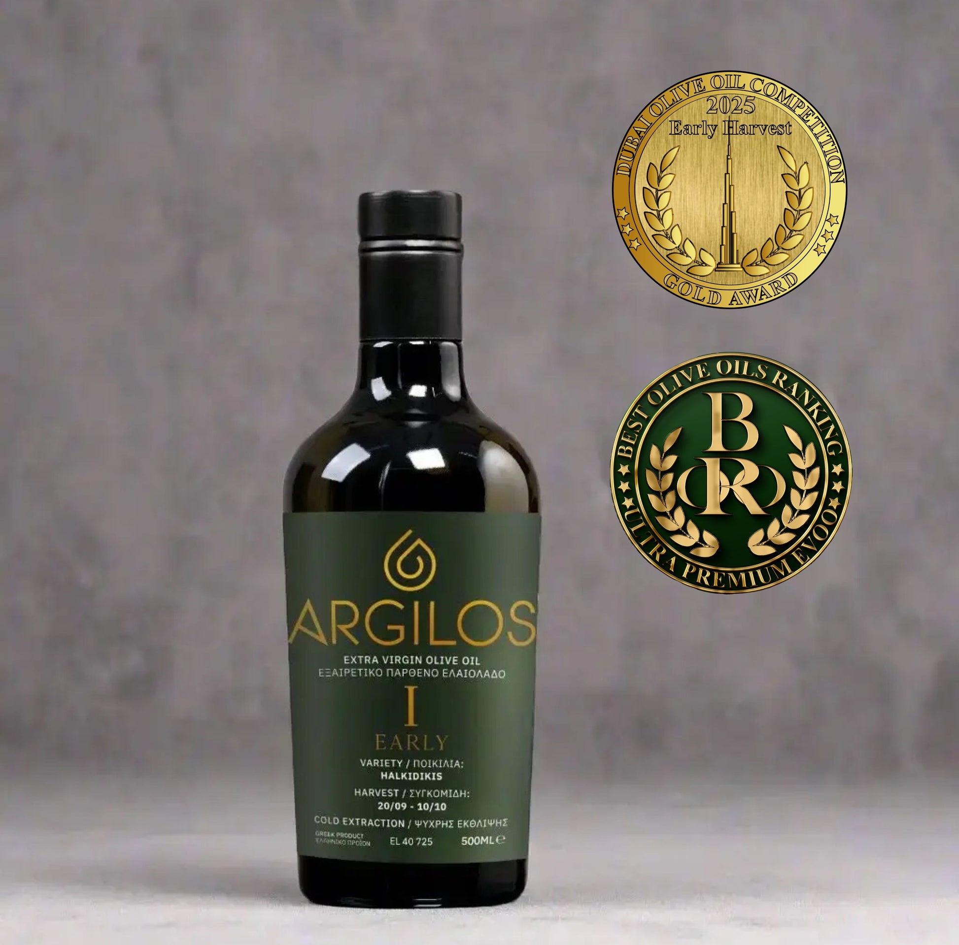 Included Products: 1× Argilos I Early Harvest Extra Virgin Olive Oil (500ml) + 1× Argilos IV Mild Extra Virgin Olive Oil (500ml).