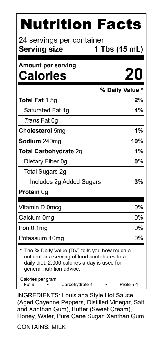 Ingredients: Louisiana Style Hot Sauce (Aged Cayenne Peppers, Distilled Vinegar, Salt and Xantham Gum), Butter (Sweet Cream), Honey, Water, Pure Cane Sugar, Xantham Gum