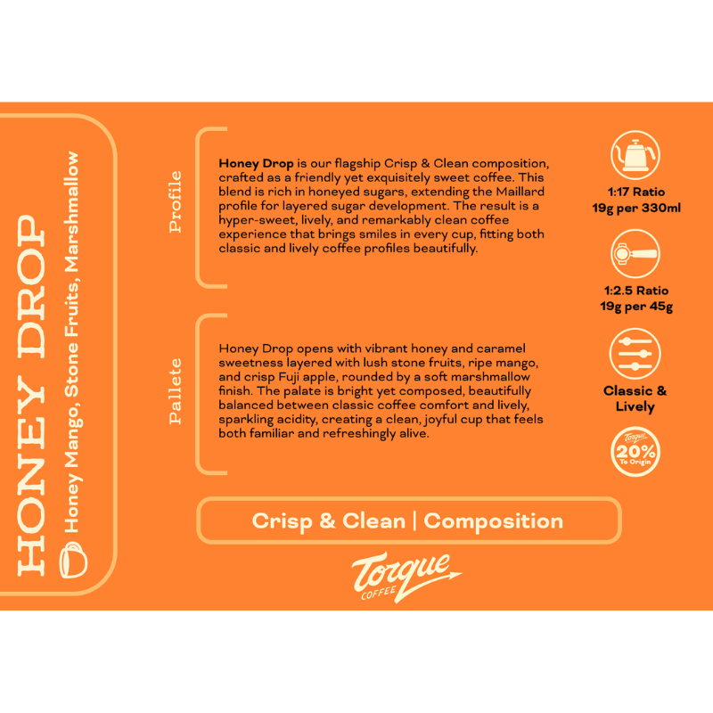 Honey Drop is our flagship Crisp & Clean composition, crafted as a friendly yet exquisitely sweet coffee. This blend is rich in honeyed sugars, extending the Maillard profile for layered sugar development. The result is a hyper-sweet, lively, and remarkably clean coffee experience that brings smiles in every cup, fitting both classic and lively coffee profiles beautifully.