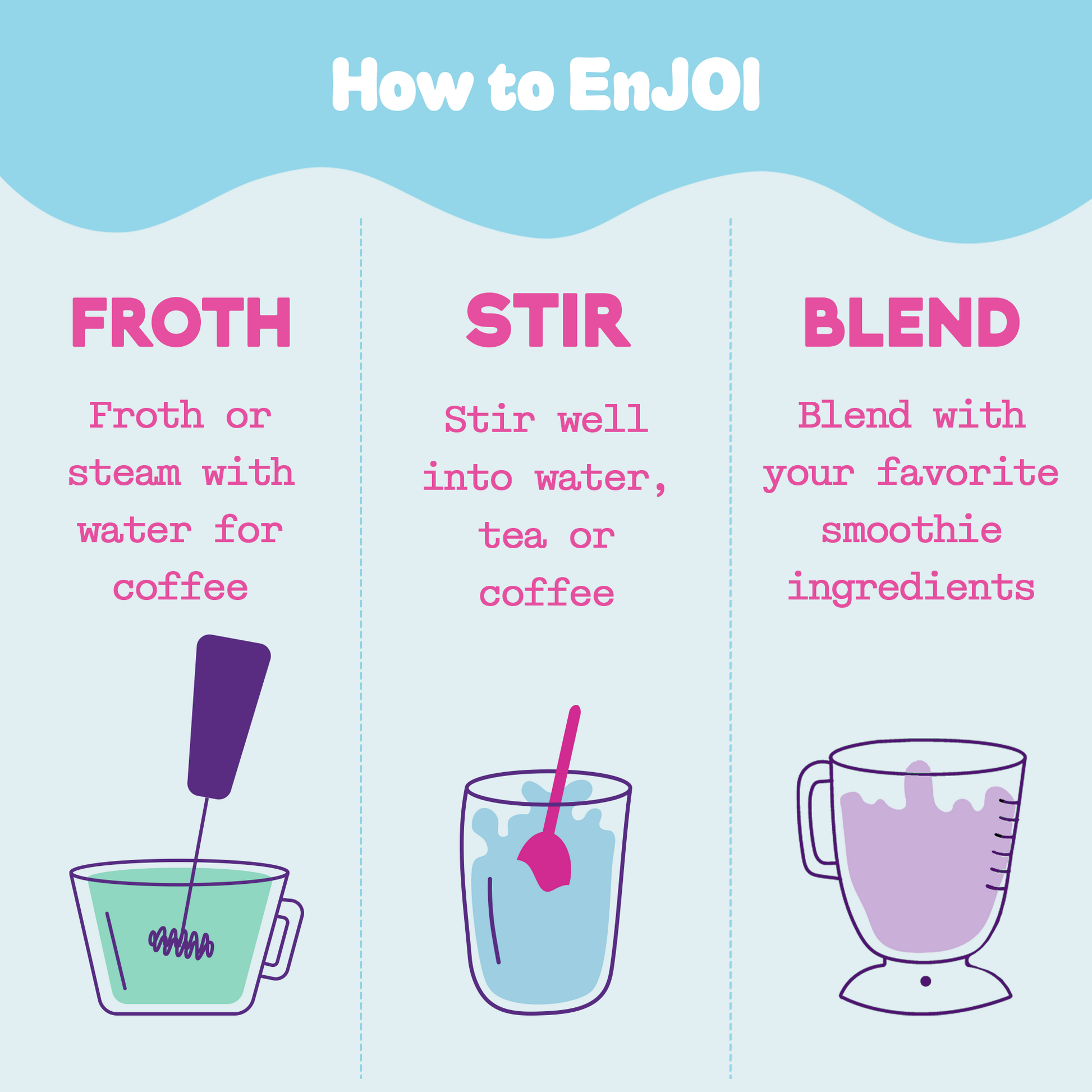 Now you can add JOI directly to your water, coffee, tea, cocoa… whatever tickles your fancy while on the road, at the office, on a boat or in the air! Just stir it up and you’re ready to go - no more blending, no more clumping, same great flavor.