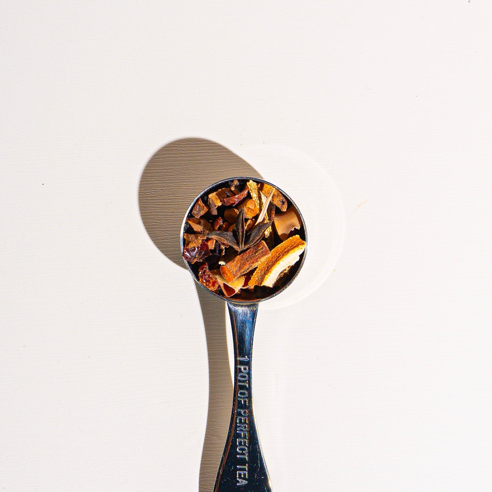 Luxury Ingredients: Apple, Hibiscus, Cinnamon, Orange, Rosehip pieces, Lemongrass root, Ginger, Cardamom, Black + White pepper, Clove, Nutmeg, and Star Anise