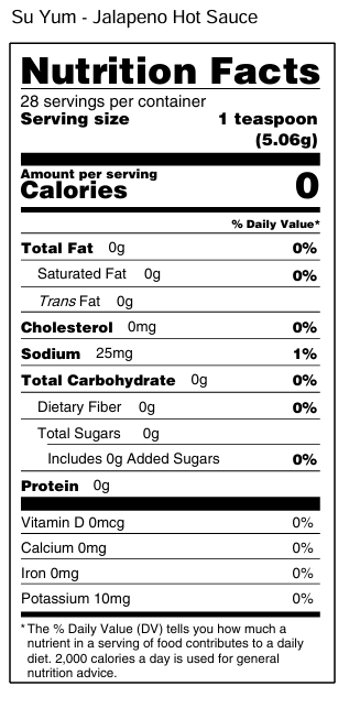 Ingredients: Distilled Vinegar, Roasted Jalapeño Peppers, Onion, Serrano Peppers, Tomatillos, Lime Juice, Sugar, Garlic, Sea Salt, Cilantro, Oregano.