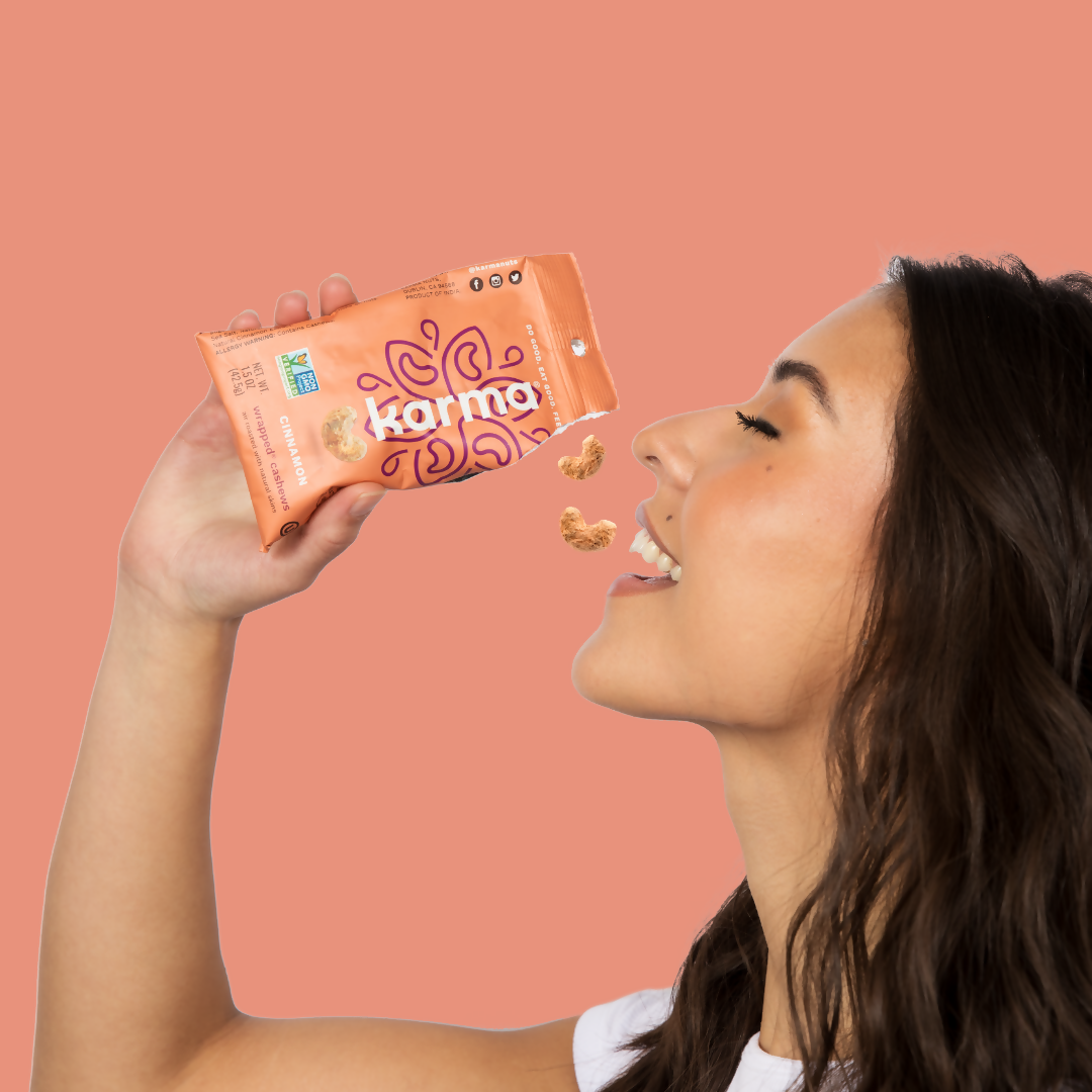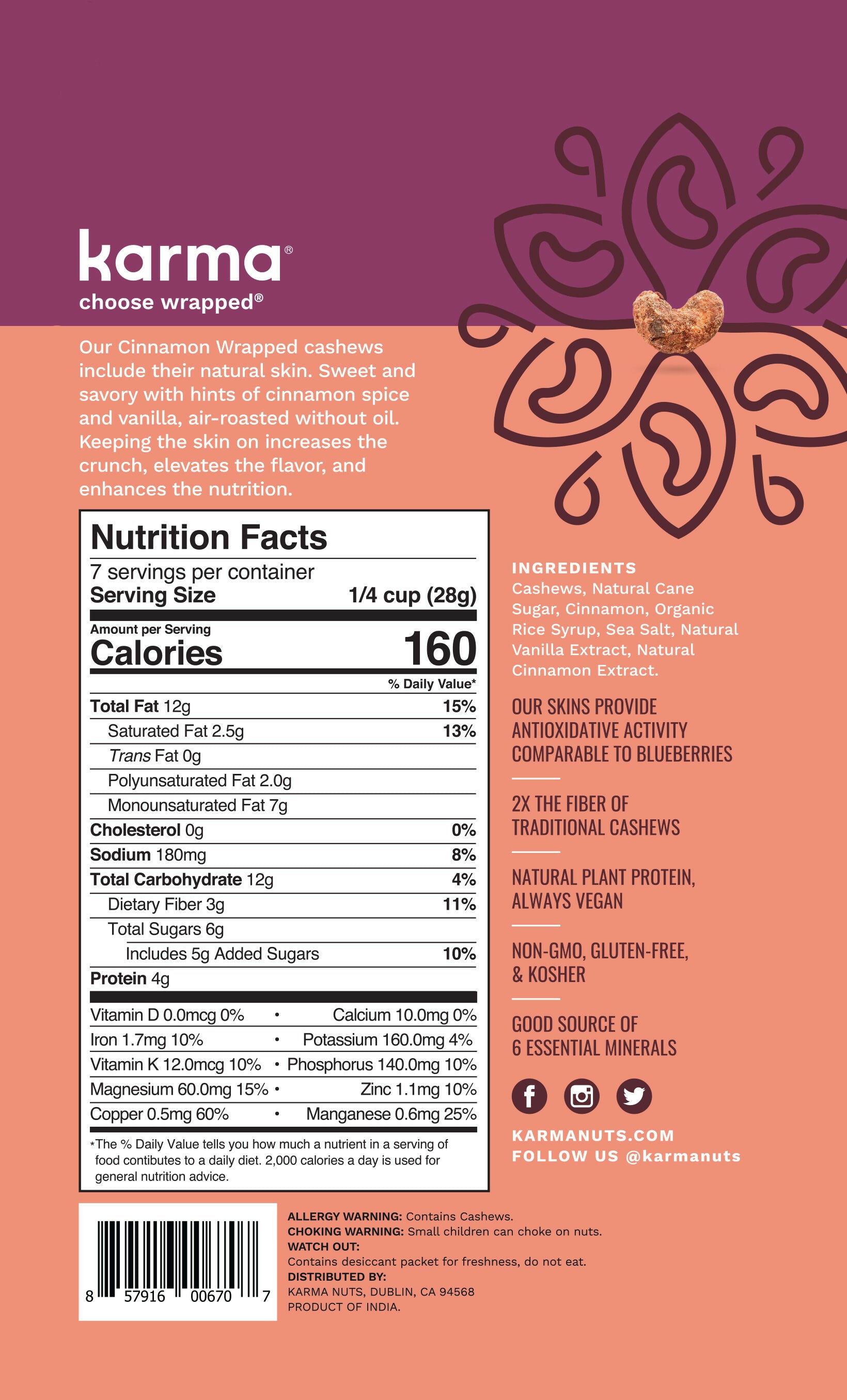 Karma Cinnamon Wrapped Cashews wholesale wants you to indulge in the guilt-free delight of our Karma Cinnamon Wrapped Cashews, sweet and savory with hints of cinnamon spice and vanilla, air-roasted with their natural skin for a unique crunch that's as nutritious as it is delicious.